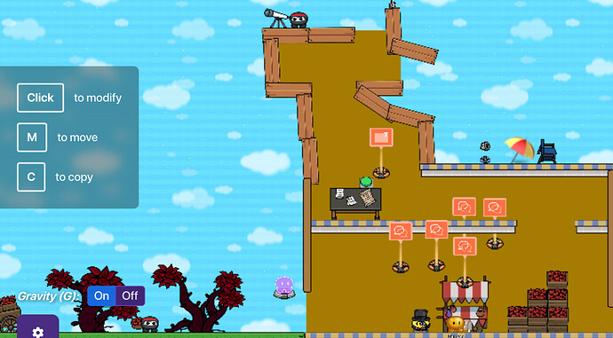 This can be used in a peaceful game where you’re supposed to just explore around. It’s tranquil, has some NPCs to interact with, and has a shop! Some nice touches are flower emojis floating around, the flower prop itself, and tinted leaves to show petals on the wind.