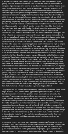 As the final week draws on, you begin to recognize patterns in the behaviors of Nightroot’s manifestations. At the beginning, it was simple crude amalgamations of stones and rubble, seemingly drawn from the depths of the park’s terrain. The disparate parts of these creature’s bodies held together by a localized magnetic field, you gave them the nickname of Bedrock. A fairly passive expression of Nightroot, they typically only act with aggression when unobserved by a camera for longer than 5 to 10 minutes (15 to 30 seconds in game time, so a roughly 27 min run time for a full night. Admittedly lengthy, so adjustments might need to be made, though you could implement a save code system so players can come back later for the more difficult nights). With activity beginning shortly after dusk at 9:00 PM, and it ceasing at 6:00 AM the following morning, the first night passed unusually smoothly. While you are usually able to keep yourself locked away within your tower, your duties sometimes force you to leave during the night, and while there is always an element of danger, it’s best to fulfill any desire for exploration early in the week before the woods become too dangerous. Of course, your tower has its own security flaws, as you will soon discover. Emerging from the caves on the second night, a swarm of Fuzzfoots driven into a feeding frenzy by druidic influence begin to stalk the trees and attack any light sources, requiring you to turn off the lights within the tower within moments of hearing the screech of an approaching cauldron as it descends over the woodland. Thankfully, the energy exerted in these flights requires long periods of rest, so such attacks are infrequent upon first encountering the creatures. On the third night, Nightroot’s power consolidates enough to form a lesser vessel of its power, the part of the druidic soul known as the Koru, possessing control over all leaves and grass within the druid’s domain. While the core manifestation is repulsed by the electricity surging through the tower from the generator, it can send smaller Skara leaf demons to chew through the wiring, or to create a hole in the gas tank of the generator. Regardless, you are forced hastily conduct repairs to the appropriate areas using a power guzzling drone, lest the Koru break down the tower door and shred your soul into a fine green mist within its swirling husk. Even once dawn breaks at the end of the night, the dead leaves of the manifestation block off paths throughout the reserve, inhibiting the speed with which you can repair campsites and evict vagrants. The fourth night introduces the Nightclaws, twisted animals that were once wolves before they were corrupted by Nightroot. Aggressive and swift, they give little warning before they clamber up the tower to attack you, requiring you to close your door and consume precious power to withstand their onslaught. In addition to the new threat, Fuzzfoot swarms become more frequent, and harsh winter winds rolling over the mountains debuff player speed and shift the remains of the Koru’s vessel, randomizing path obstructions. As a new moon rises over the darkened reserve on the final night, Nightroot’s spirit uses its last reserve of strength to give itself a physical form for its full spirit. A pale, rotting trunk of wood rises from the Earth at the mountain’s base, and begins steadily approaching the tower. Behaving similarly to Bedrock, it can be held at bay by cameras, ut destroys them if observed for too long in a single session. This isn’t likely to be a concern, as you will still have to contend with Fuzzfoots and Nightclaws swarming the tower as you attempt to slow the progression of the Nightroot. In a form this potent, you stand no hope of defeating it should it reach the tower, and thus you can only hope to delay it in a desperate last stand as you pray for dawn to break and cast this nightmare into oblivion.