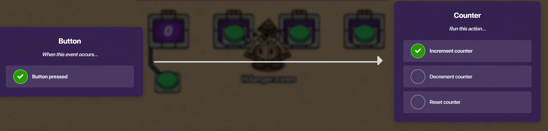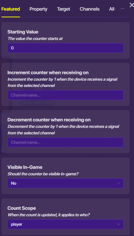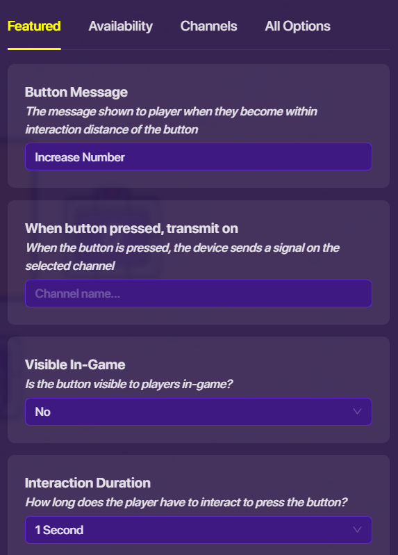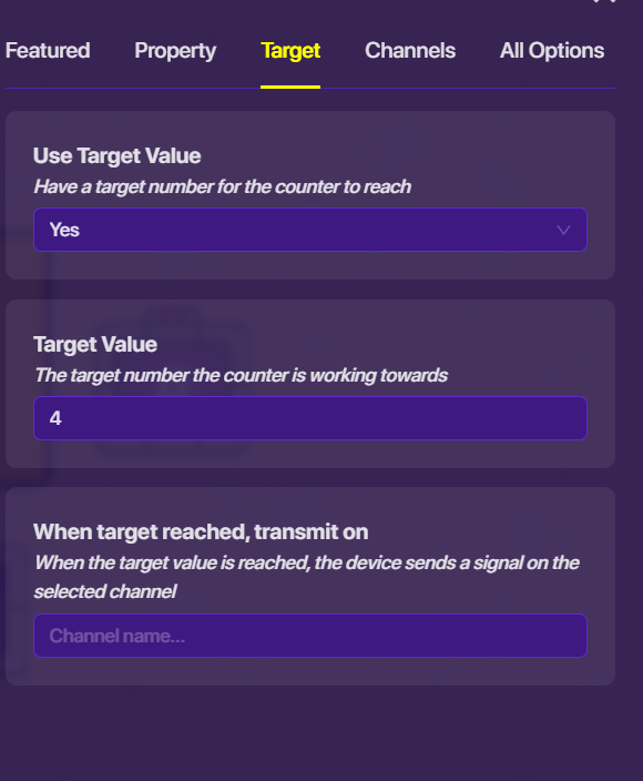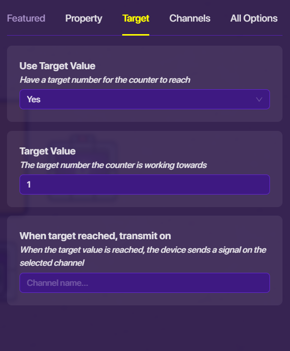 Open your button settings. Navigate to the “Channels” menu. Under “When Button Pressed, Transmit On”, put in “Increase1”. Now, go into the settings of the counter it will control, and once again, navigate to the “Channels” menu. Under “Increment Counter When Receiving On”, put in “Increase1”.