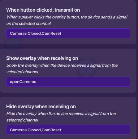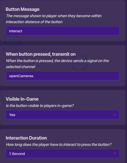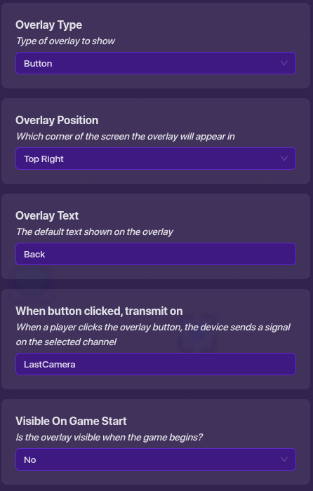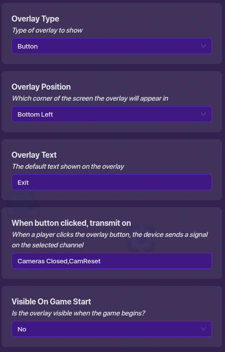 I have just gone and tested it on my own and @some_kid yes that is what I meant… and on the camera point dropdown it should say: “Make sure you have the Close Camera game overlay to: When Button Clicked, transmit on - camReset”