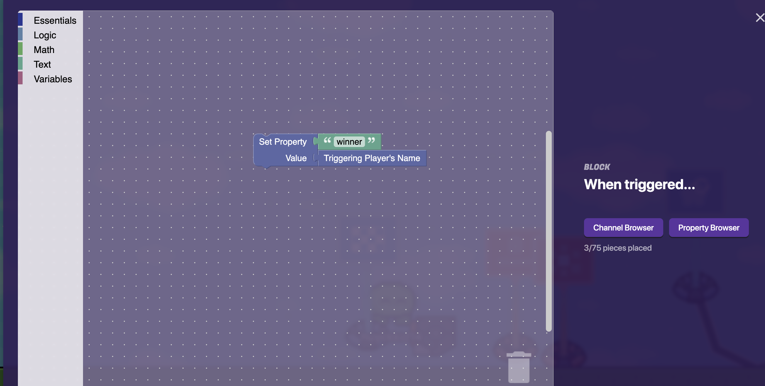 When Trigger Activated – Set Winner Property to Triggering Player Name–Show End Game Widget