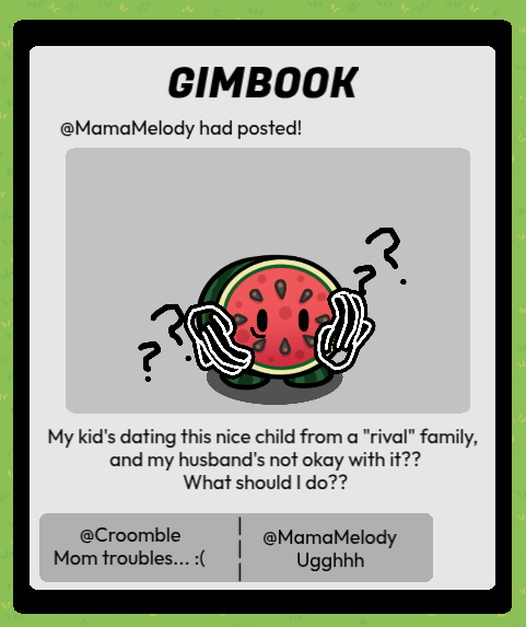Gobble’s m0m is pretty much fine with it (She married into the family and doesn’t hold the familial grudge) but Seed Sid is… pretty ticked off. Feast’s parents don’t know.
