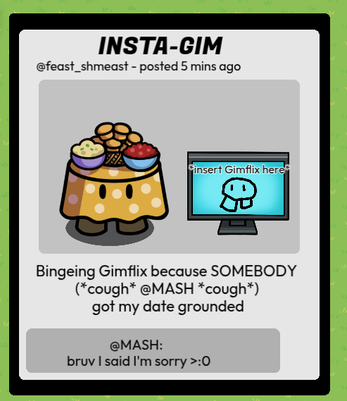 Mash did not have the couple’s permission to post that photo, they’re gonna be in hot water once Feast finds out (Gobble got grounded by his dad, Seed Sid)