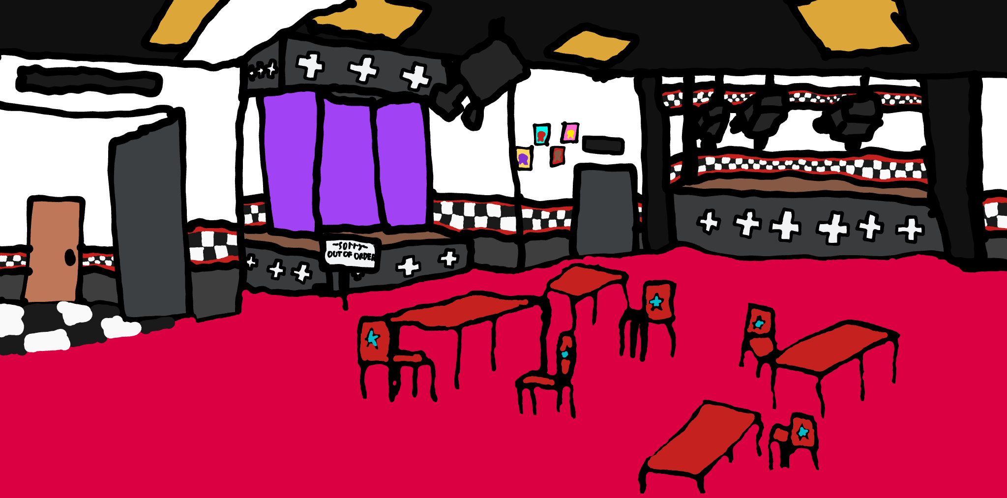 I may need to extend my said time that it would be finished because I still have to draw Bonnie’s guitar, Chica’s cupcake, Freddy’s microphone, the night guard’s hat, color in the dining area and add the title!