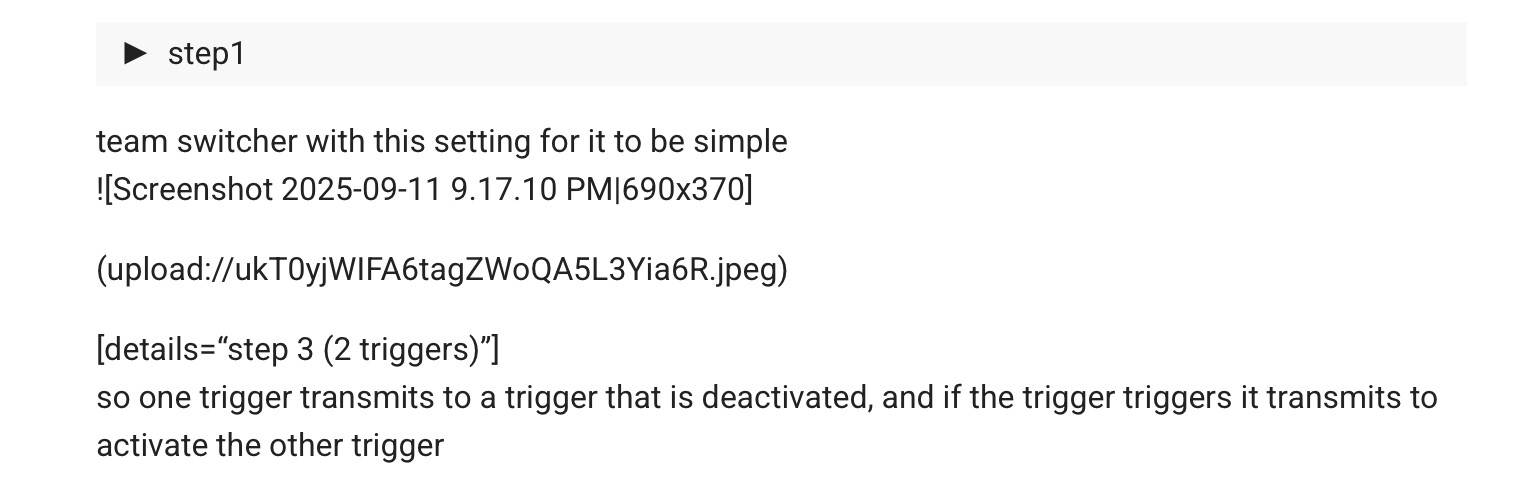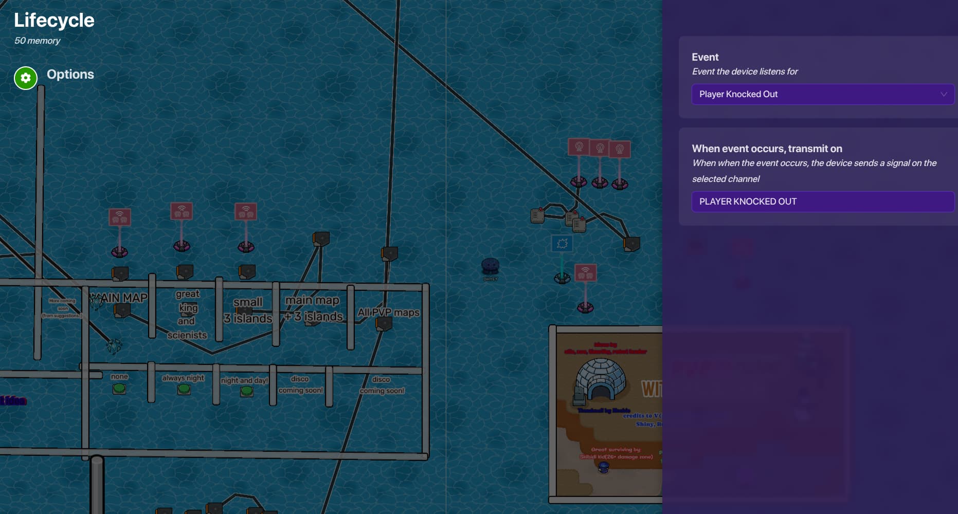 so one trigger transmits to a trigger that is deactivated, and if the trigger triggers it transmits to activate the other trigger. when a player is knocked out (as listed in lifecycle channel in 1st step) the activated trigger will trigger