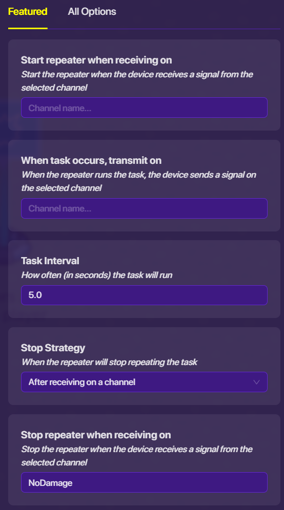 If you wanted to make it a little more memory efficient, you could instead have a trigger loop. Set 2 triggers to trigger each other, and add your desired delay to one of them, and trigger that one on game start. Wire the trigger loop to another trigger that connects to the damager. When you want to activate the trigger loop, simply activate the third trigger, and to deactivate the trigger loop, deactivate the third trigger.