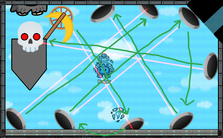 So here’s what I’m doing. I finally got around to making one of the bosses, but I’m having trouble with his special attack. You see, when the player enters the arena zone, after 10 seconds he opens a portal, then a second later launches a laser into it. then another 2 portals open, wait a second, then the laser travels between those two. then two more appear, so on and so forth. eventually, the laser hits him, deals 300 damage and removes all the lasers. 10 seconds later, he repeats the attack. If he is knocked out by the lasers or a gadget, the lasers and portals are deactivated, and a staircase appears, leading out of the arena.