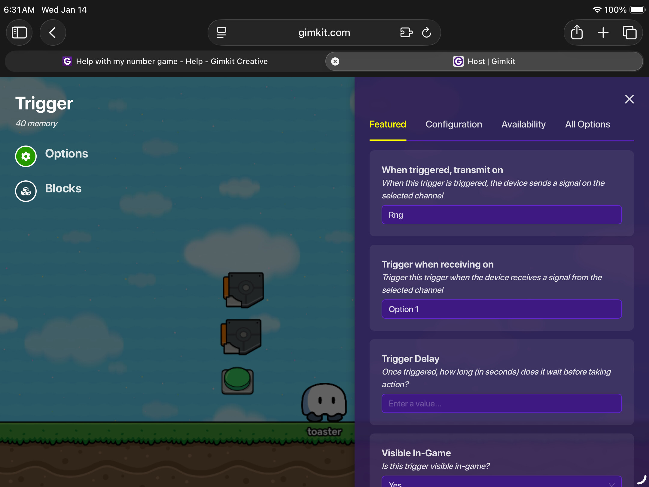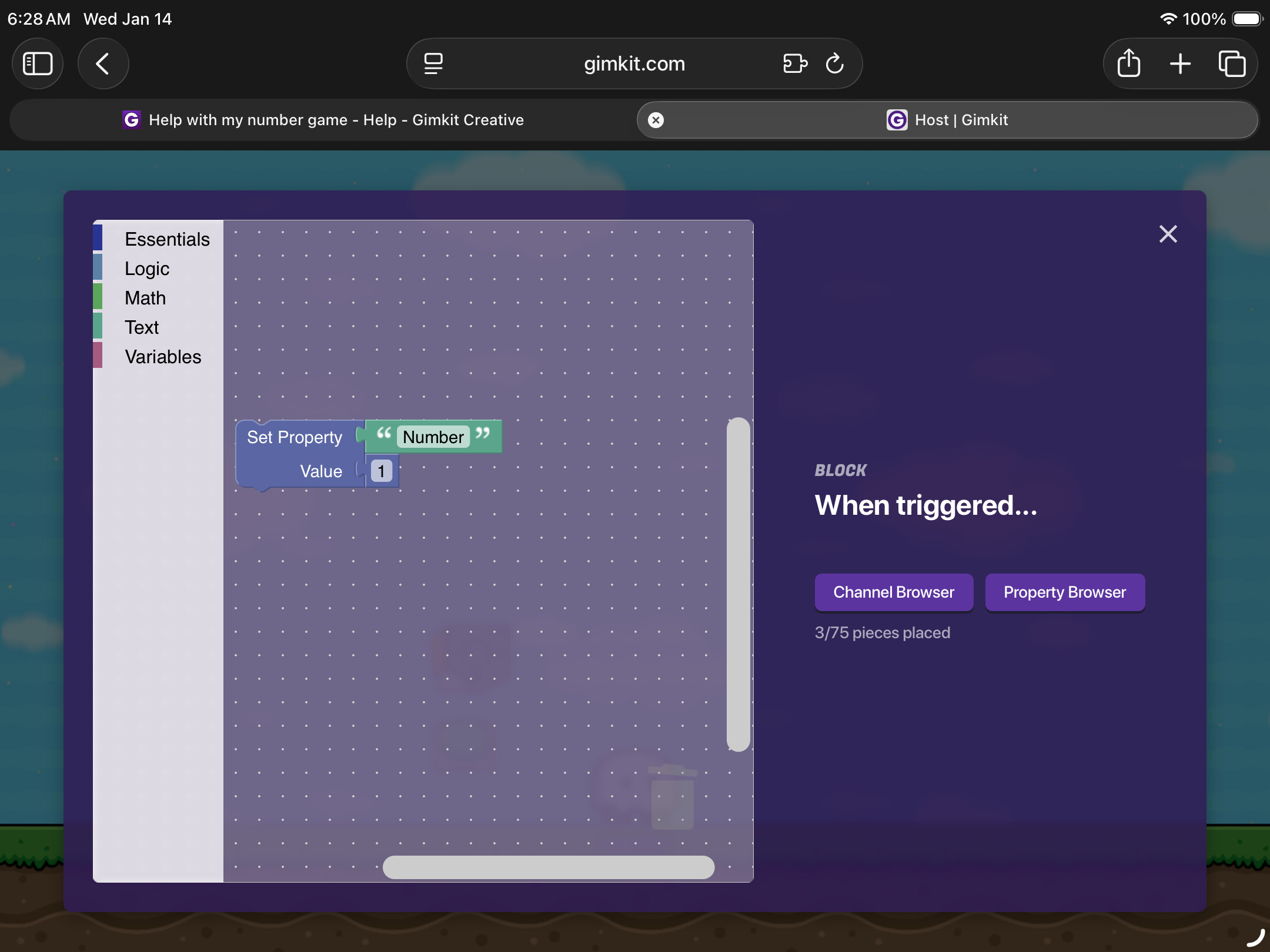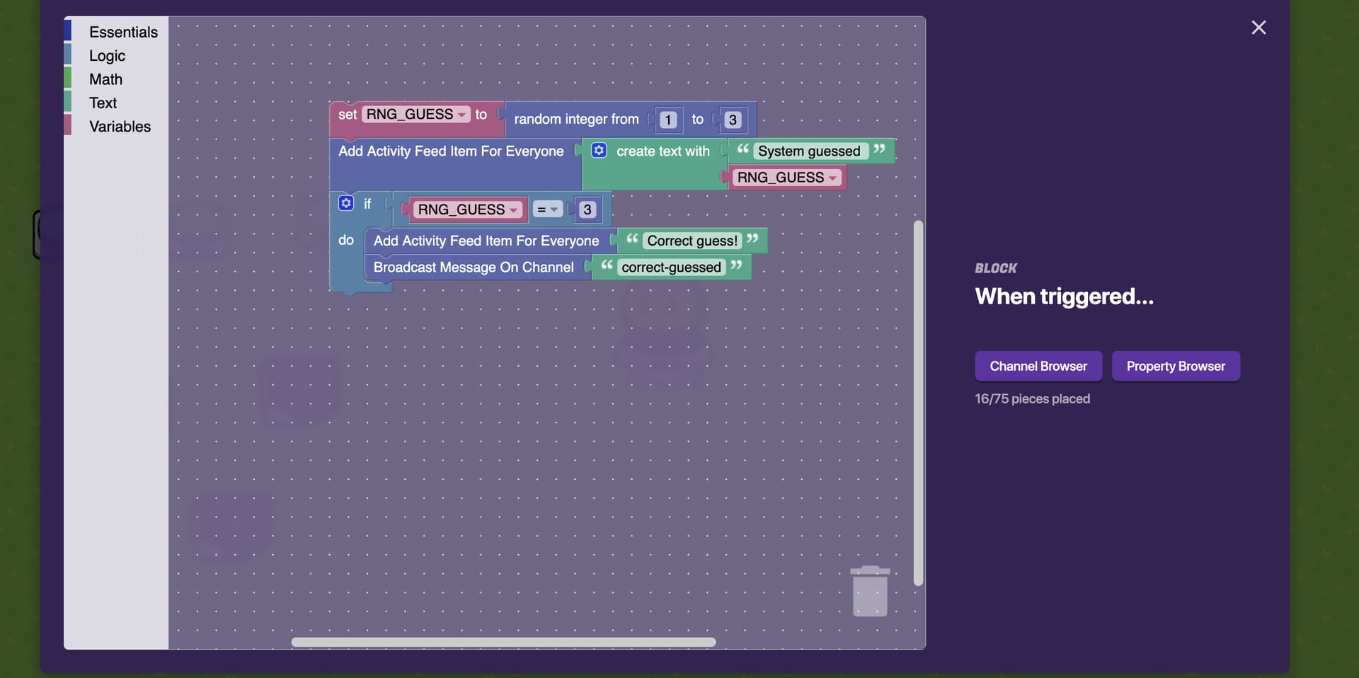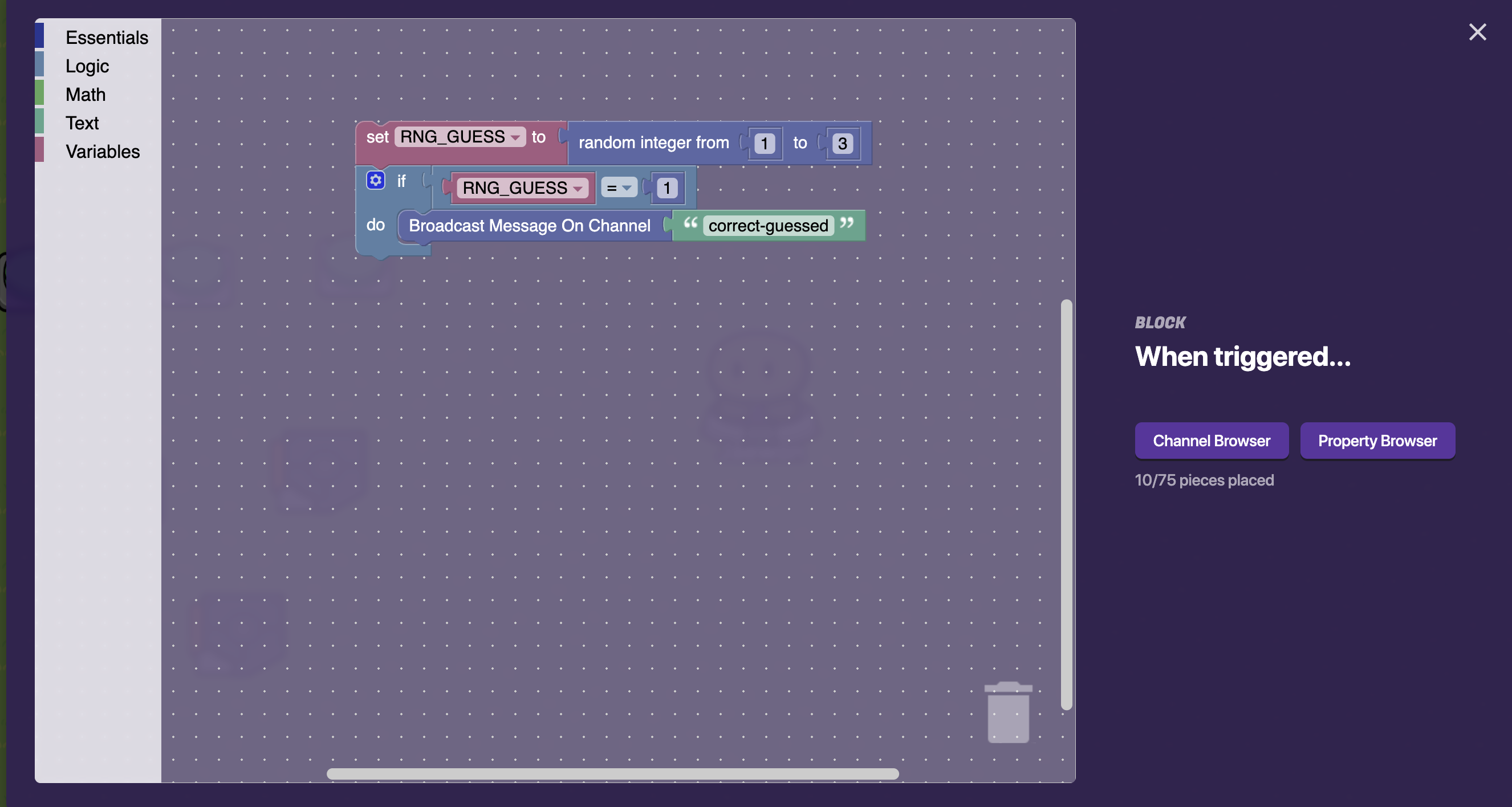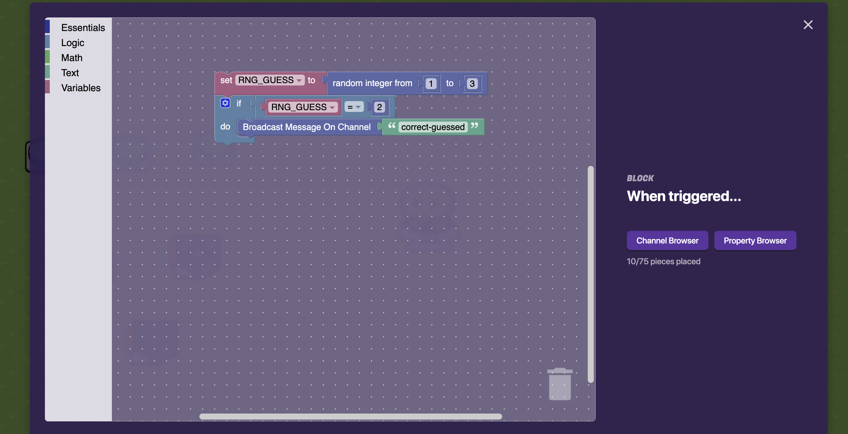 These images are for the rng and the settings of the trigger its in, the else part is left empty to do nothing if the number doesn’t match, you can change this if you want. In the block code the cut off property is the “Number” property, it just couldn’t fit on screen.