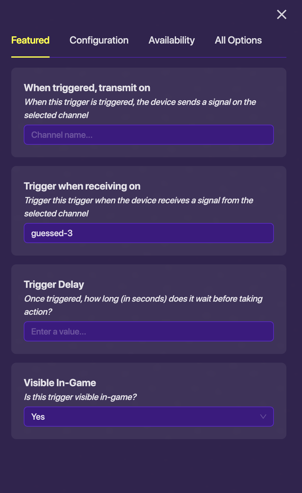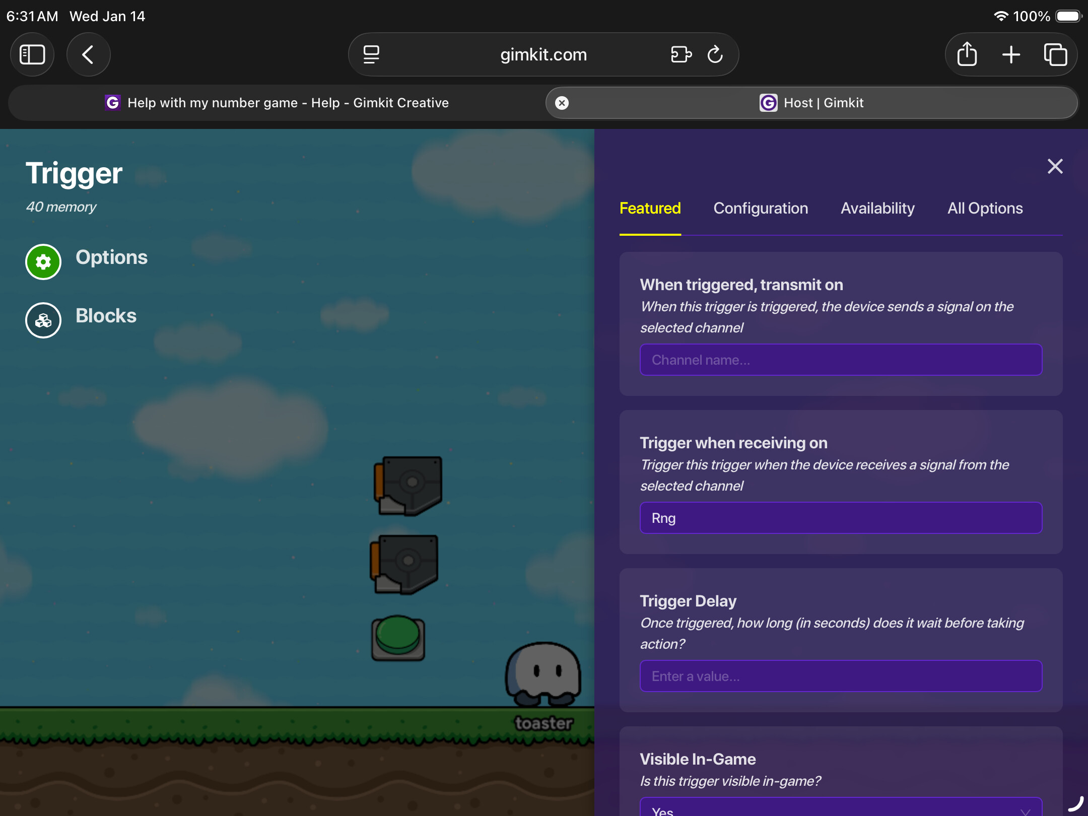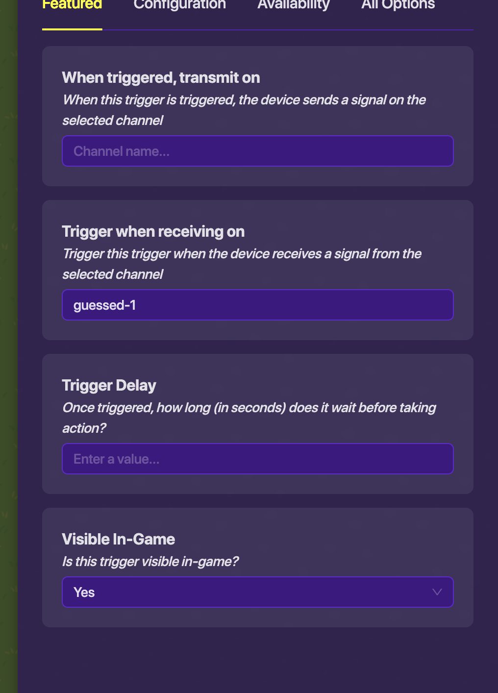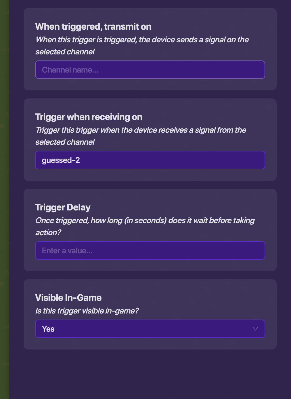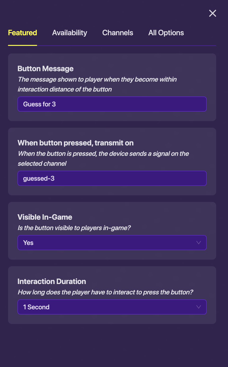 These three images are the settings & block code for the button and first trigger, You have to copy and paste this 2 times and change the channels and block code with “1” in it to “2” and in the next set “3”.