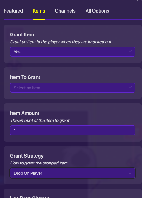 Also how do you make a player drop items when knocked out because I’m in map options & they only say keep or delete.
