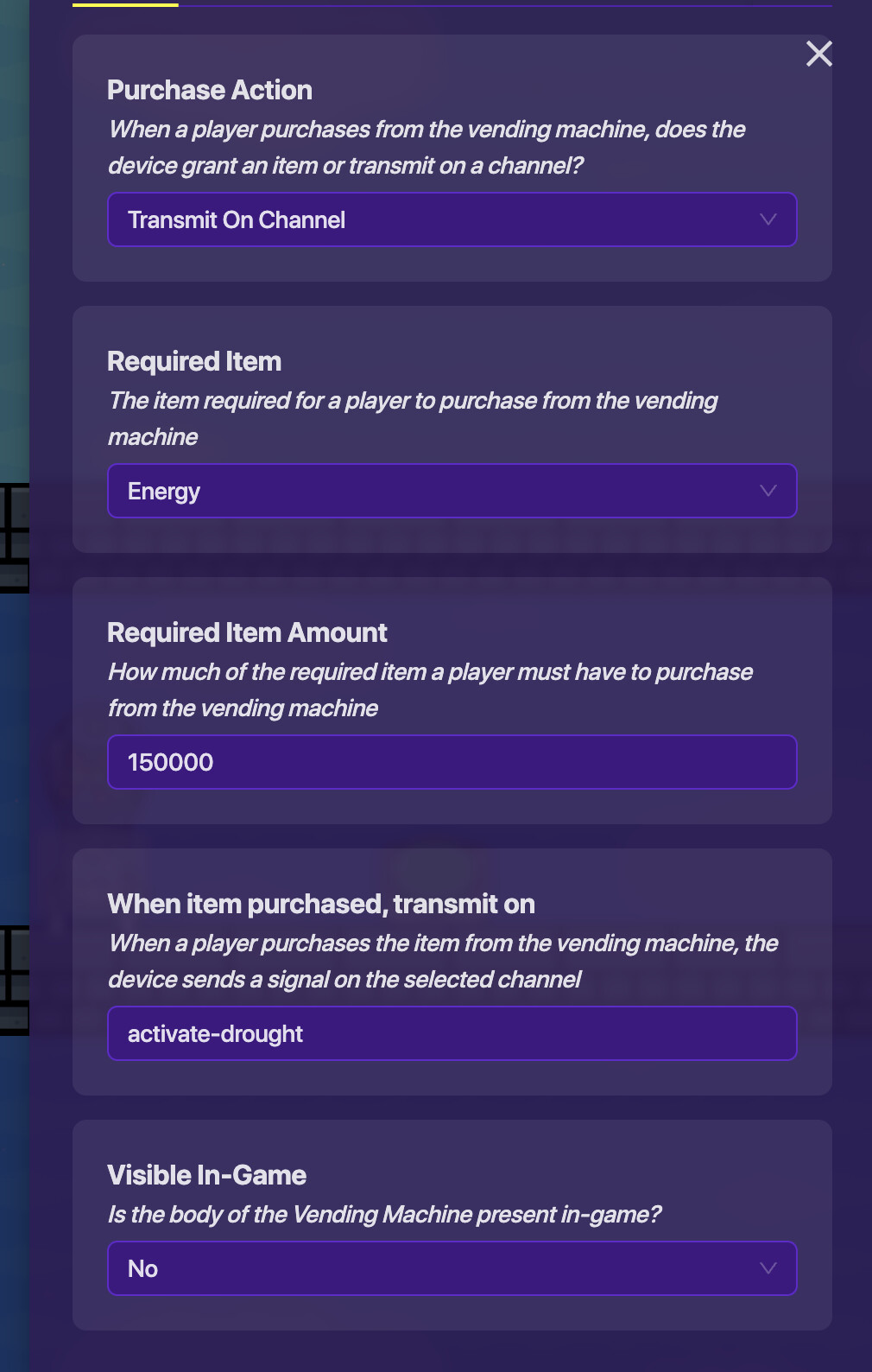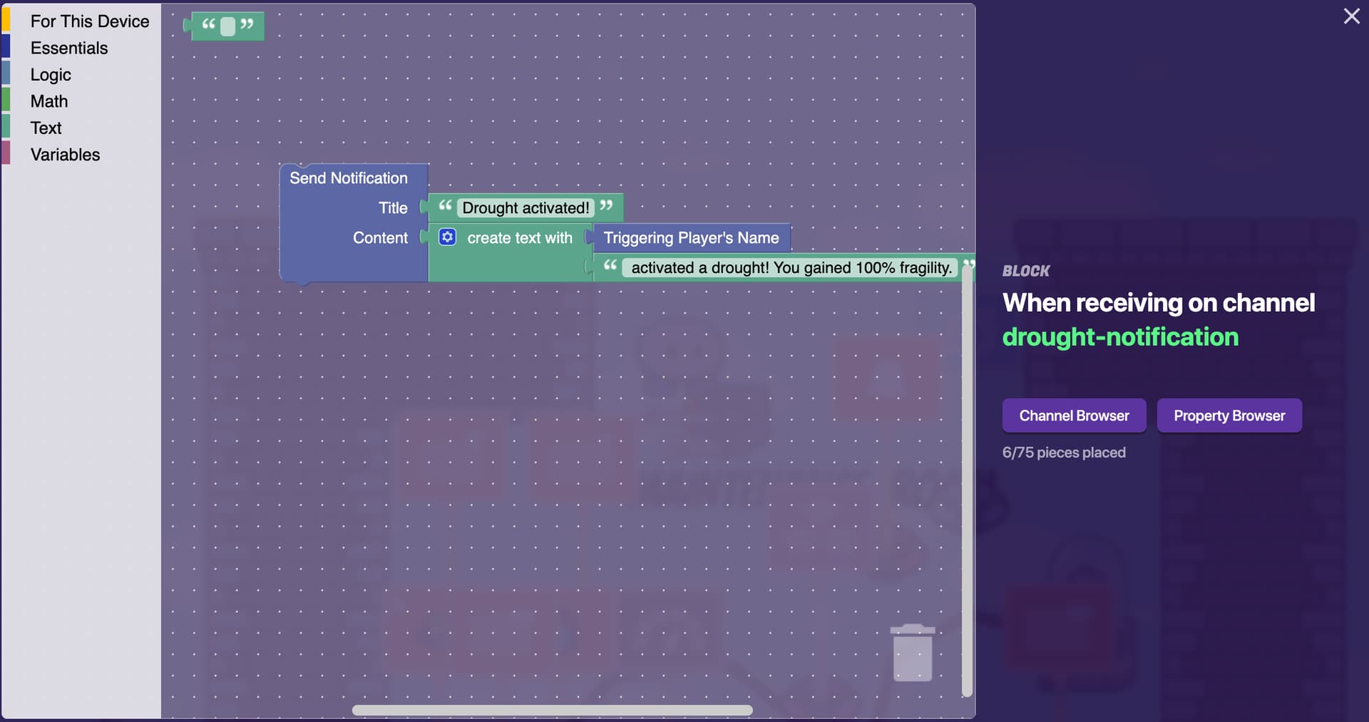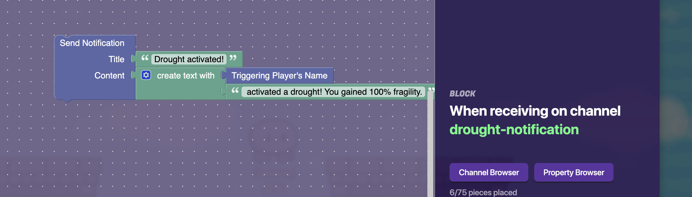 so i have a vending machine that sends channel activate-drought when purchased. so activate-drought should add 100% fragility to everyone except the player who purchased it and an alert shows to everyone excpt purchase player “[name of player who purchased the drought] activated a drought! You gained 100% fragility.”