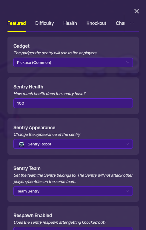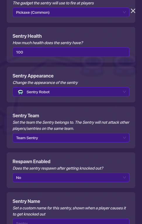 This sentry is going to be hit by the projectile so you don’t have to have it so set the team to sentry and it’s gadget to be a common pickaxe because we don’t want it to do anything,