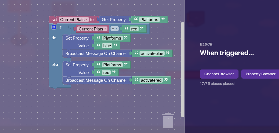This block code basically checks what the platforms value currently is, toggles it to a different value, then broadcasts to activate barriers of that type.
