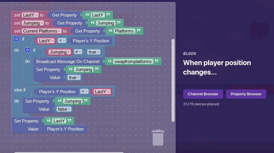 This code checks that whenever the position of the player changes, if the Y is greater than the last Y property, if it is, and we didn’t already set jumping to true, we set jumping to true and broadcast to swapfromplatforms, if the Y was LESS than the lastY property we set jumping to false. after these checks we set the lastY property to the players current Y position.