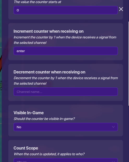 enter. Grab a counter, and make sure it increments when receiving on enter, too. (Also make it not visible in game, and have its scope set to player).Counter Settings: