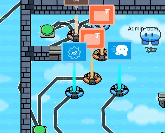 now add 2 checkers for the first 1 set check one to channel admin and trigger it to run when the trigger is triggered if it passes teleport them to the admin room 6 as ]for the other checker make it check for punishment when trigger is triggered connect a damager to oof player if it passes.
