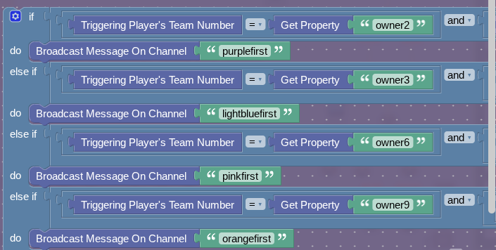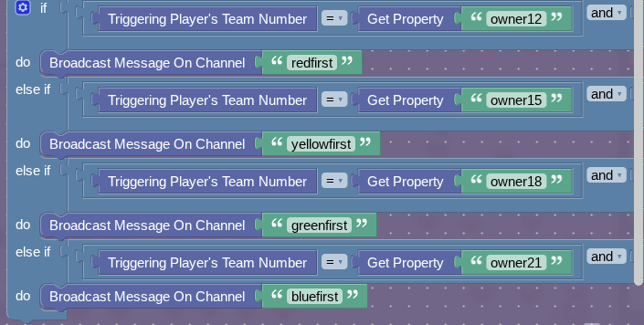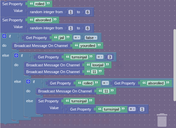 Now make the respective properties and then you should be done. Oh, and for the item granter that handles the squareat property, make when receiving on channel 31 set jail to true and broadcast 41. Have the jail section receive on 41.