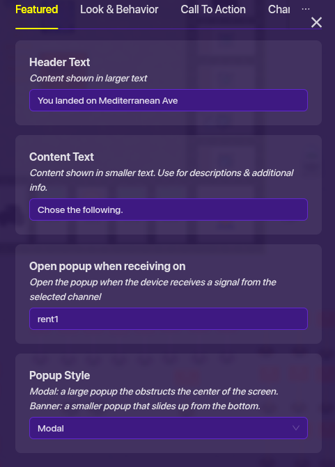 Now, get 22 popups. Open when receiving rent1, rent2, so on like you are probably used to by now. Now, it is very hard to explain this part, so please ask questions if you have any. On the popup receiving rent1, it is associated with Mediterranean Ave. So for the popup receiving rent1, it has these settings: