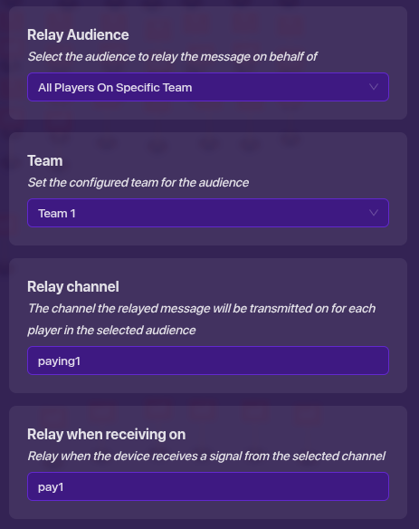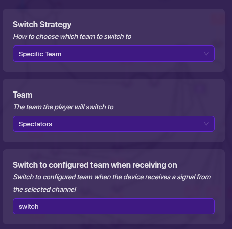 Ignore the relays to the side, but look at the wire repeaters, trigger, player counter, relays, and team switcher. The reason I used wires was because I use a ton of channels, and I felt like simplifying things with wires, especially things would probably use numbers, and I use a ton of those elsewhere. Lastly, get a team switcher and set it to this: