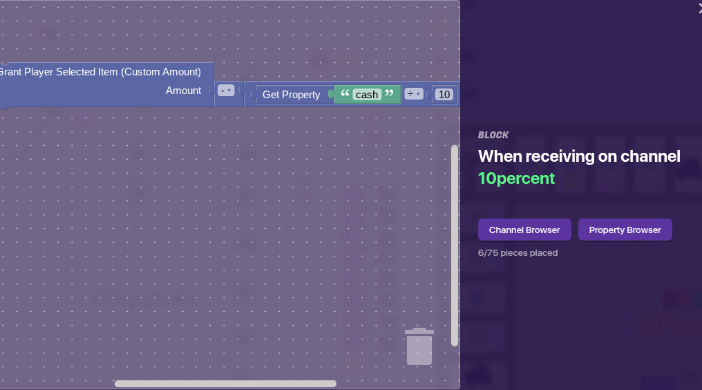 Now let me explain what is going on, so that not only will you understand better, but you will learn. First, we have to roll the dice, so we set the properties rolled and alsorolled to a random number 1 - 6. This is actually not 100% random, the computer will follow an algorithm. But, it is more random than rolling an actual dice, so it will work. Next, we send a notification, that in the end, will say the number in total that you rolled for the title, followed by [player’s name] rolled a [rolled] and a [alsorolled]. Next, we use an if/else block to see if the two properties are equal, basically seeing if we rolled doubles. Finally, we actually move the player. We see if the two number of dice plus a property called squareat is less than forty. If it is, then we broadcast the sum of all three, like 5, 19, or 31. This teleports you to the square, because of what we did earlier with the teleporters and zones. But if it is greater than 40, then it does the same but 40 less, and you pass go. We subtract 40 because our teleporters go up to 40, then you go back to 1. Now, get an item granter that grants you 200 cash when receiving on pass go.