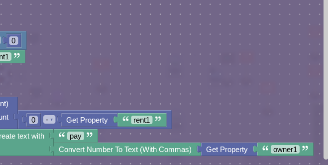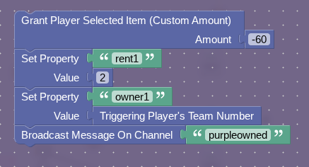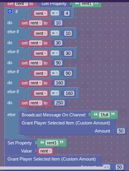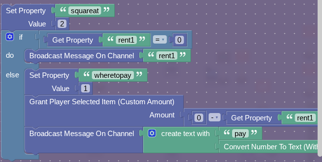 Now, when it is buy2, make it rent2, owner2, so on, I think you get the point. The owner2 property will always be set to the triggering players number, but the rent property will be set to how much the starting rent is, which if people want I will list. Now, the whole rent mechanism should be complete!
