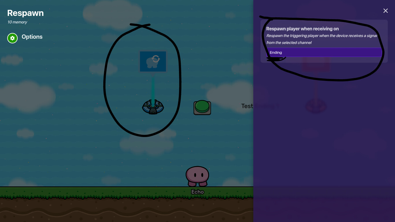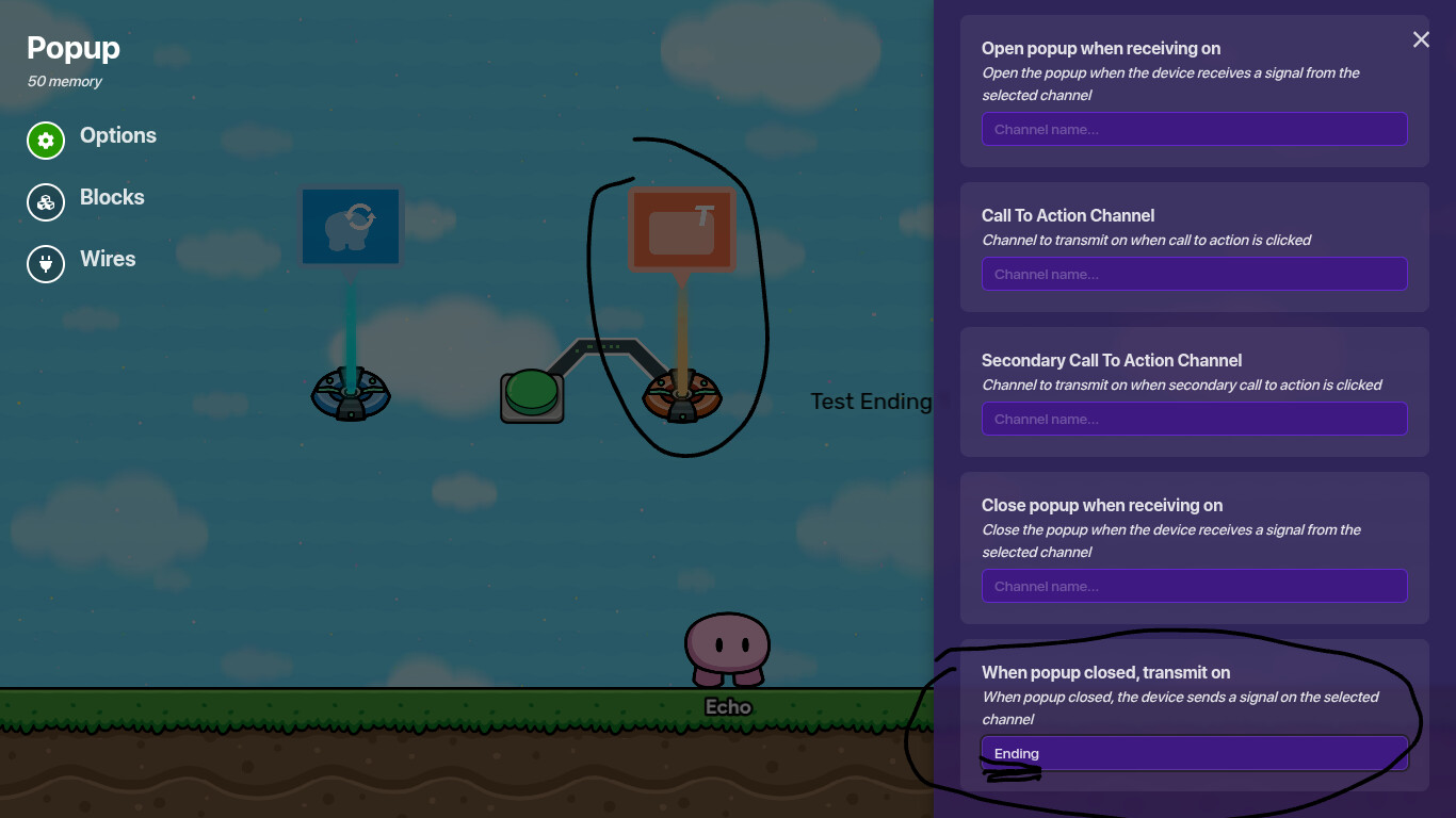 Start with the re-spawn device. Set it device to re-spawn the player when it receives on ‘Ending’ (Just type ‘ending’ into the ‘Re-spawn player when receiving on’ box.) Now, connect the whatever you used to trigger the ending (A zone, button, checker, ect.) to the popup. Then, click, when button pressed, or when player enters zone, or whatever trigger your device uses, as well as ‘open popup.’ Now go to the wire settings of the popup, and