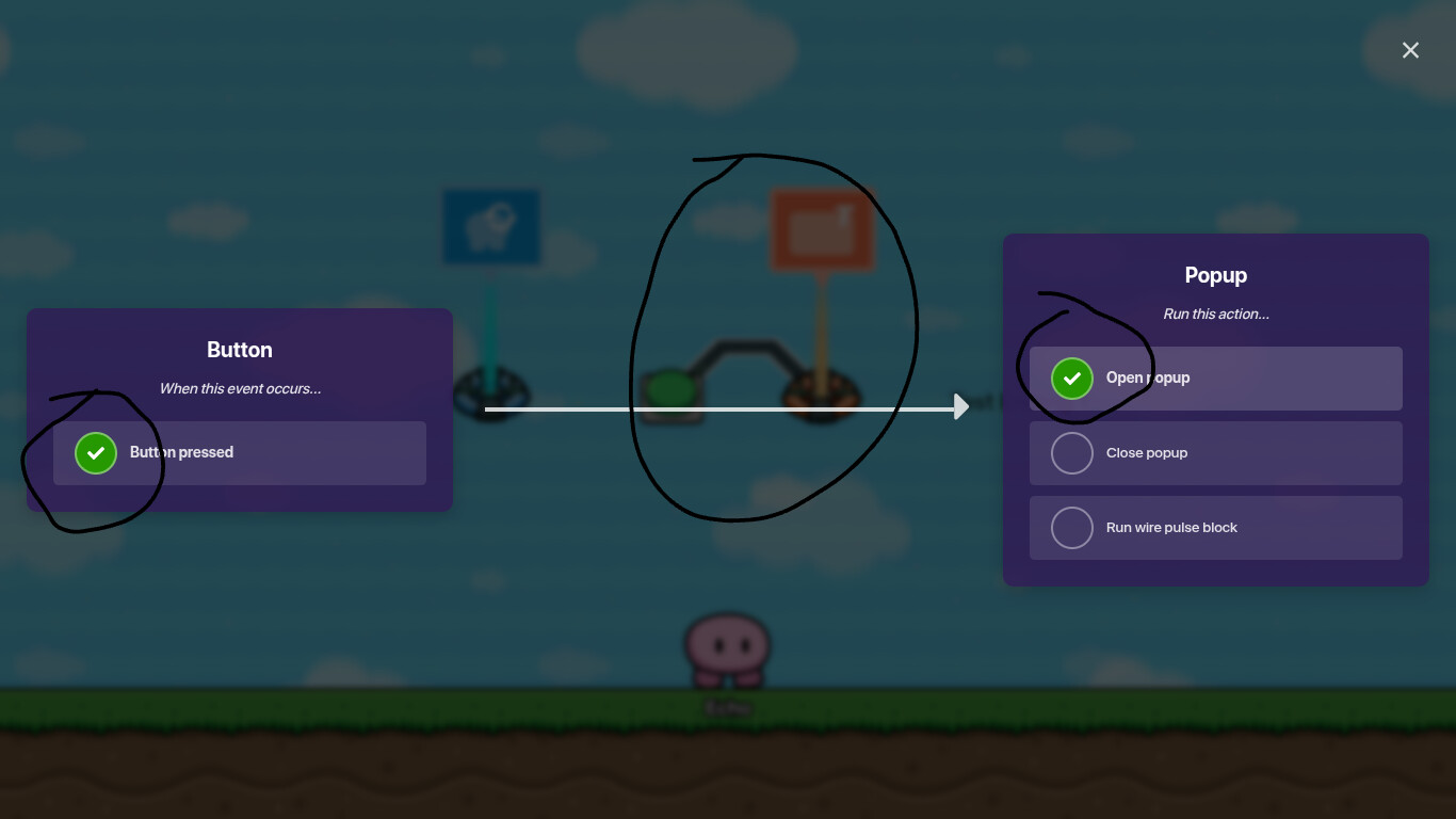 put ‘ending’ in when popup closed, transmit on. Finally, connect a wire from the popup to the text, and click ‘when popup closed’ and ‘hide text’. That’s are there is to it!
