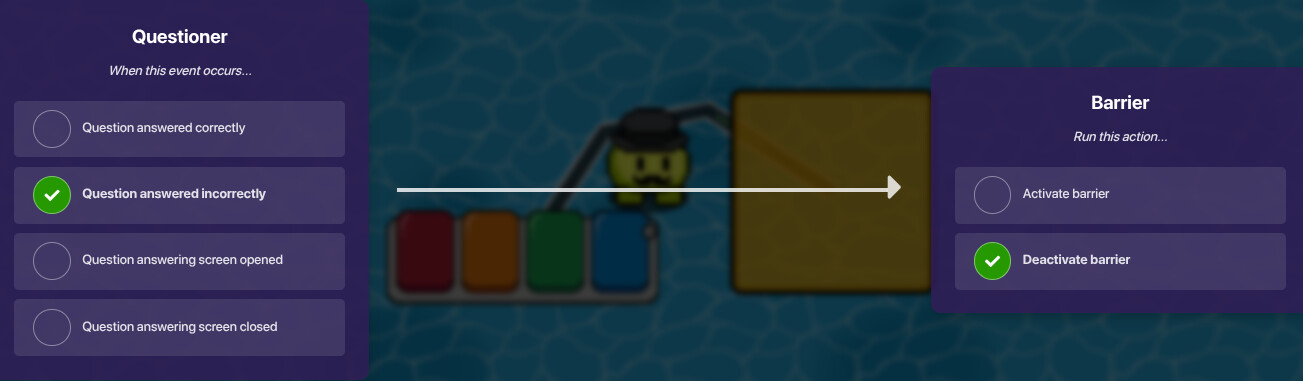 Player gets question incorrect, barrier activates, otherwise, barrier deactiavates if question answered correct.