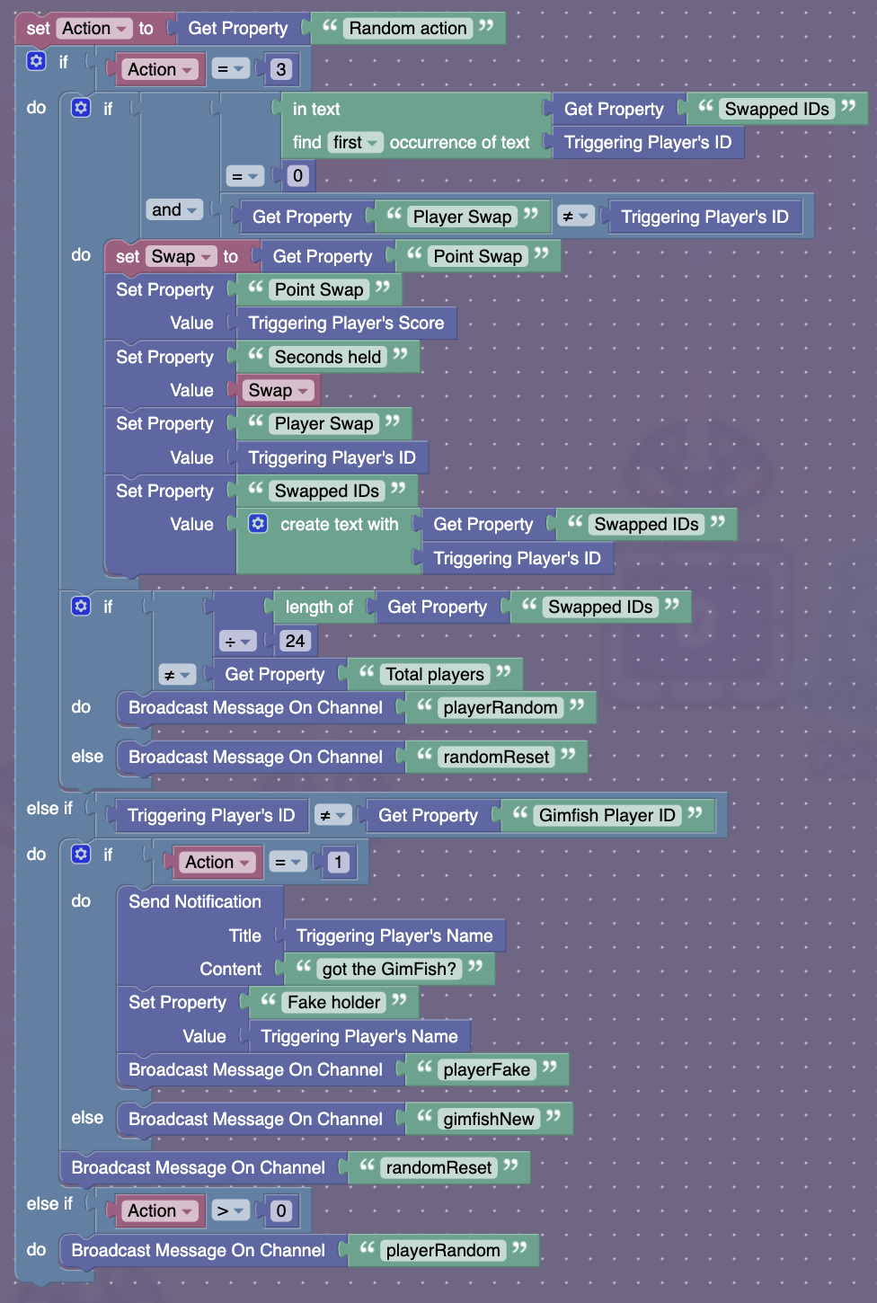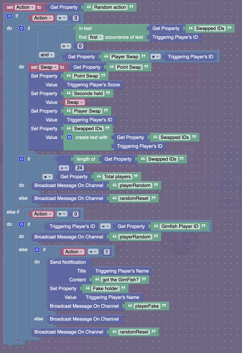 I need to save 1 block of code. This is in a notification device. The idea behind this block is to handle 3 separate actions when a player is chosen at random. When the action is 1, it is used to create a diversion. When the action is 2 (the last else statement) it just needs to broadcast on a channel. For both 1 and 2, if a certain player is picked, the action does not go through and another player is selected. The third action is used to mix up everyones scores and ends when all players scores have been changed. All I need is 1 block so I can make the 2nd action work.