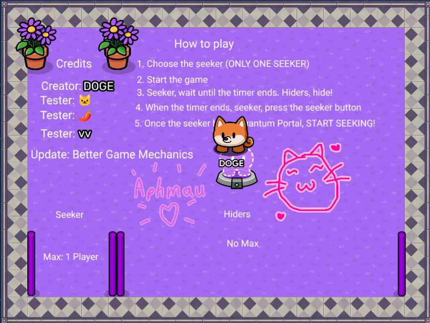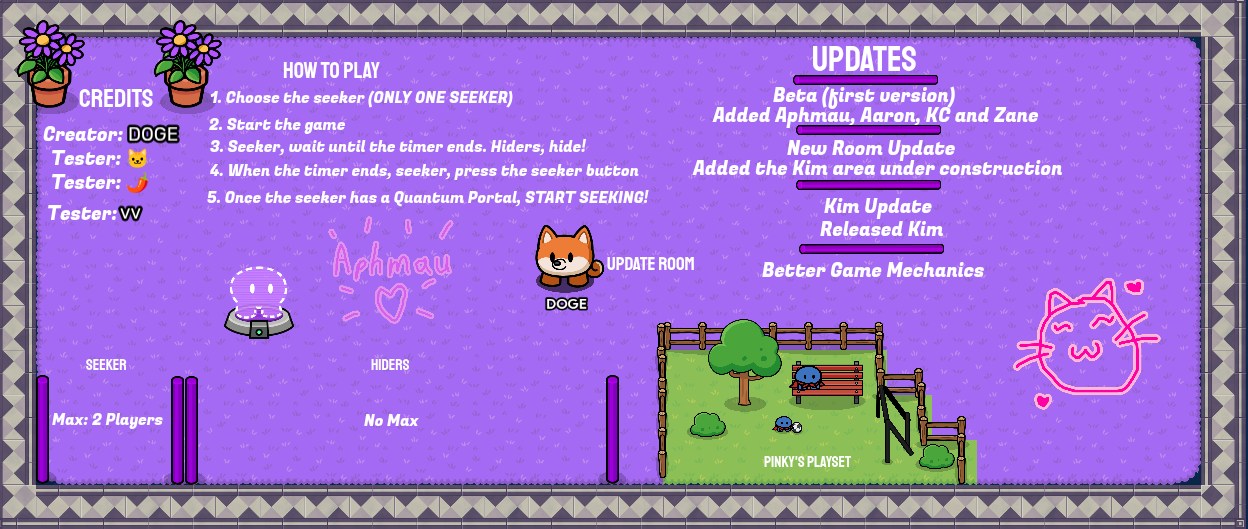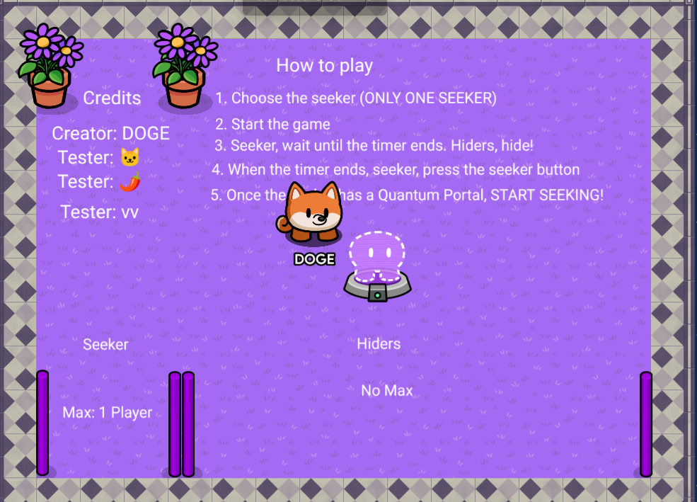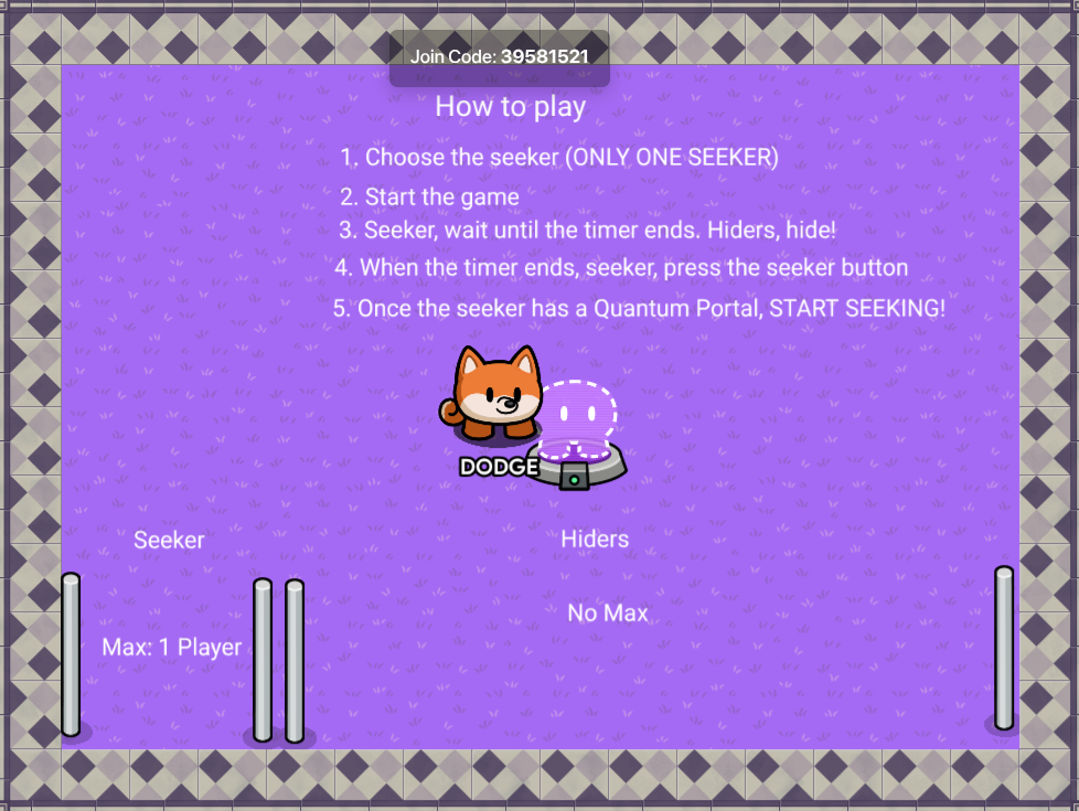 So, this is my current waiting room, I’ve put down how to play and choose boxes (enter in to choose who the seeker is and who the hiders are), but I’ve run out of ideas!!!