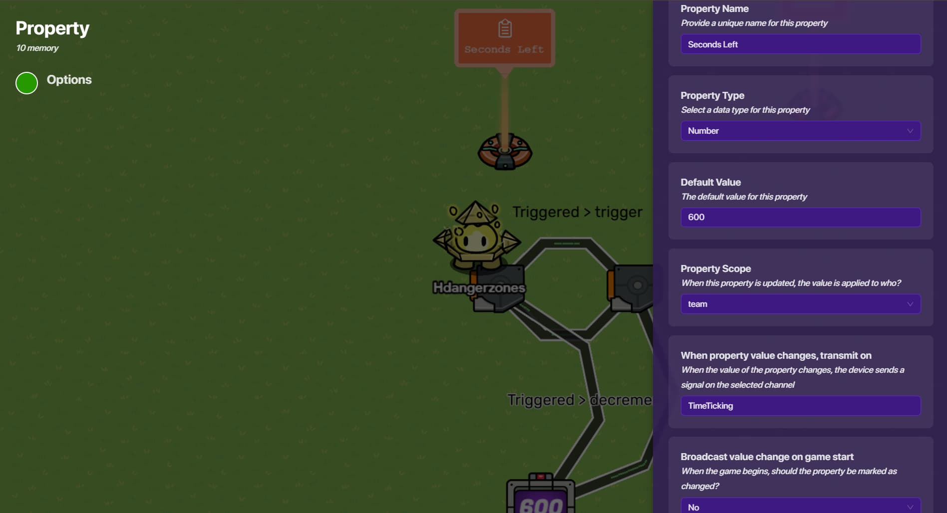 Next, you’re going to want to add a property device with the same name as the one the counter updates. Make sure the default number is 600, as well as the property type being a number and team-scoped. Finally, make it broadcast on a channel. I used “TimeTicking”, but you can (obviously) use whatever you want.