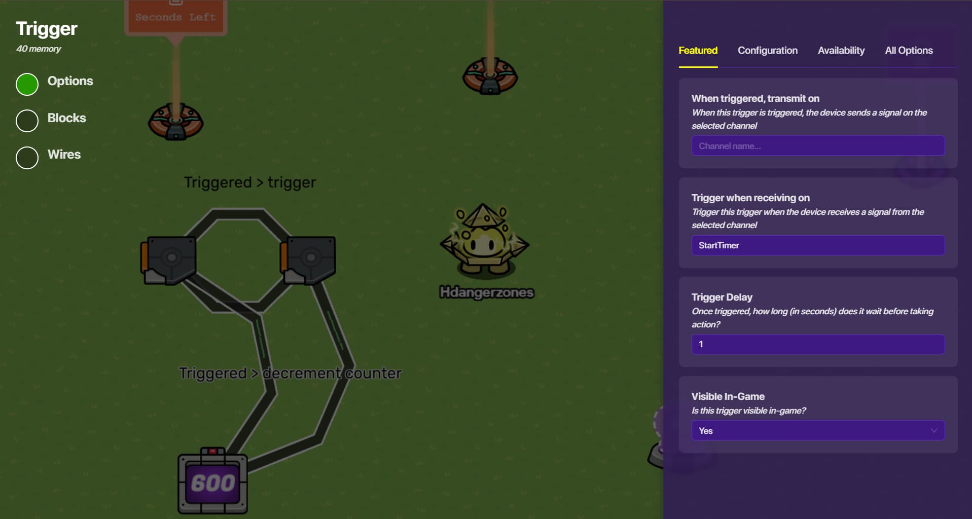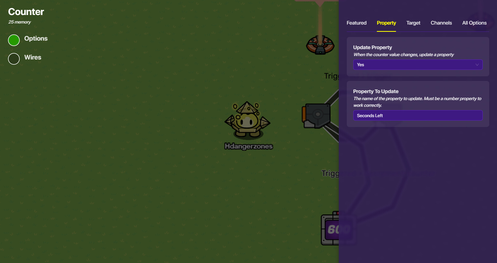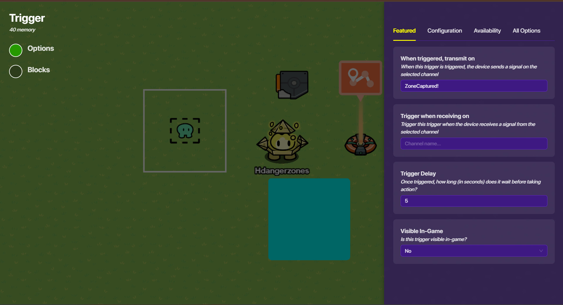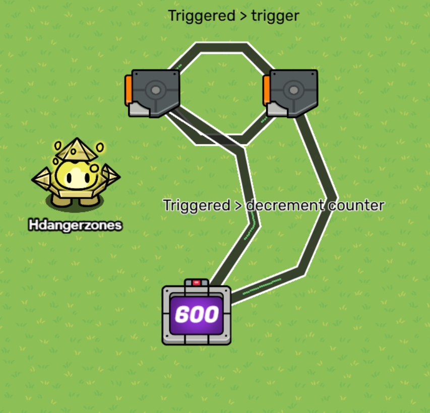 We’re going to have to rig up ANOTHER timer, but this one has a little difference. Simply add your two triggers that each have a delay of 1 second and trigger each other and wire it to your counter with the starting value of how many seconds it’ll take to capture the zone. The concept is exactly the same as the steps somewhere above to make the game timer, but without the game overlay, the blocks, and the channels.