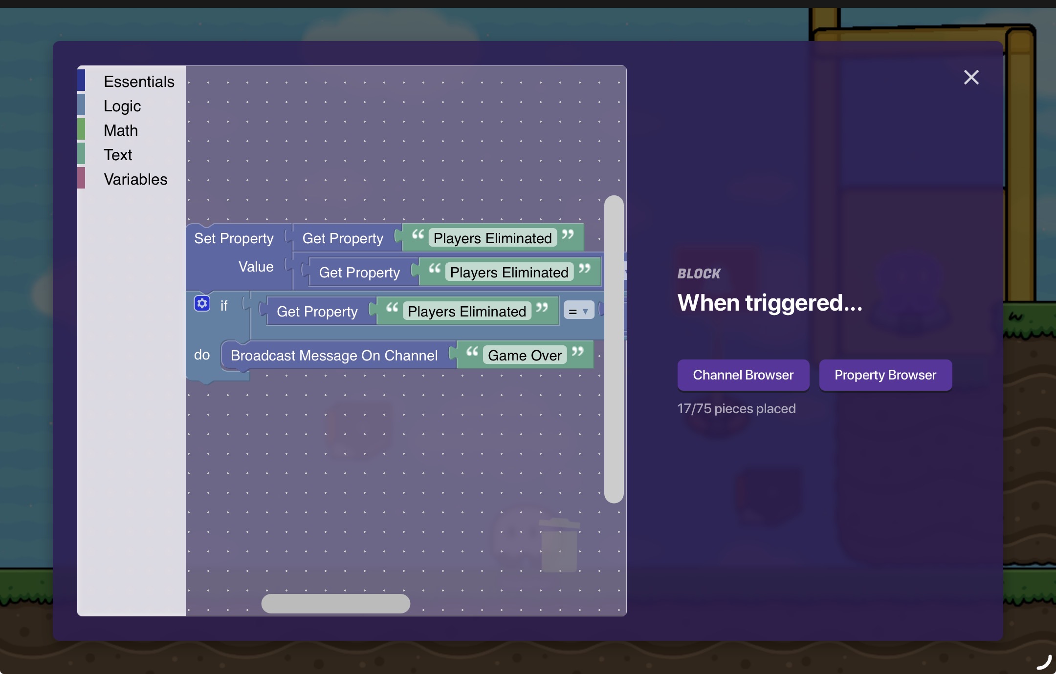 This extra bit of block code will basically trigger on this channel when there is 1 player left by seeing if the players eliminated is 1 less than the player count. The game over channel can do whatever you want, give the winner money, end the game, etc.