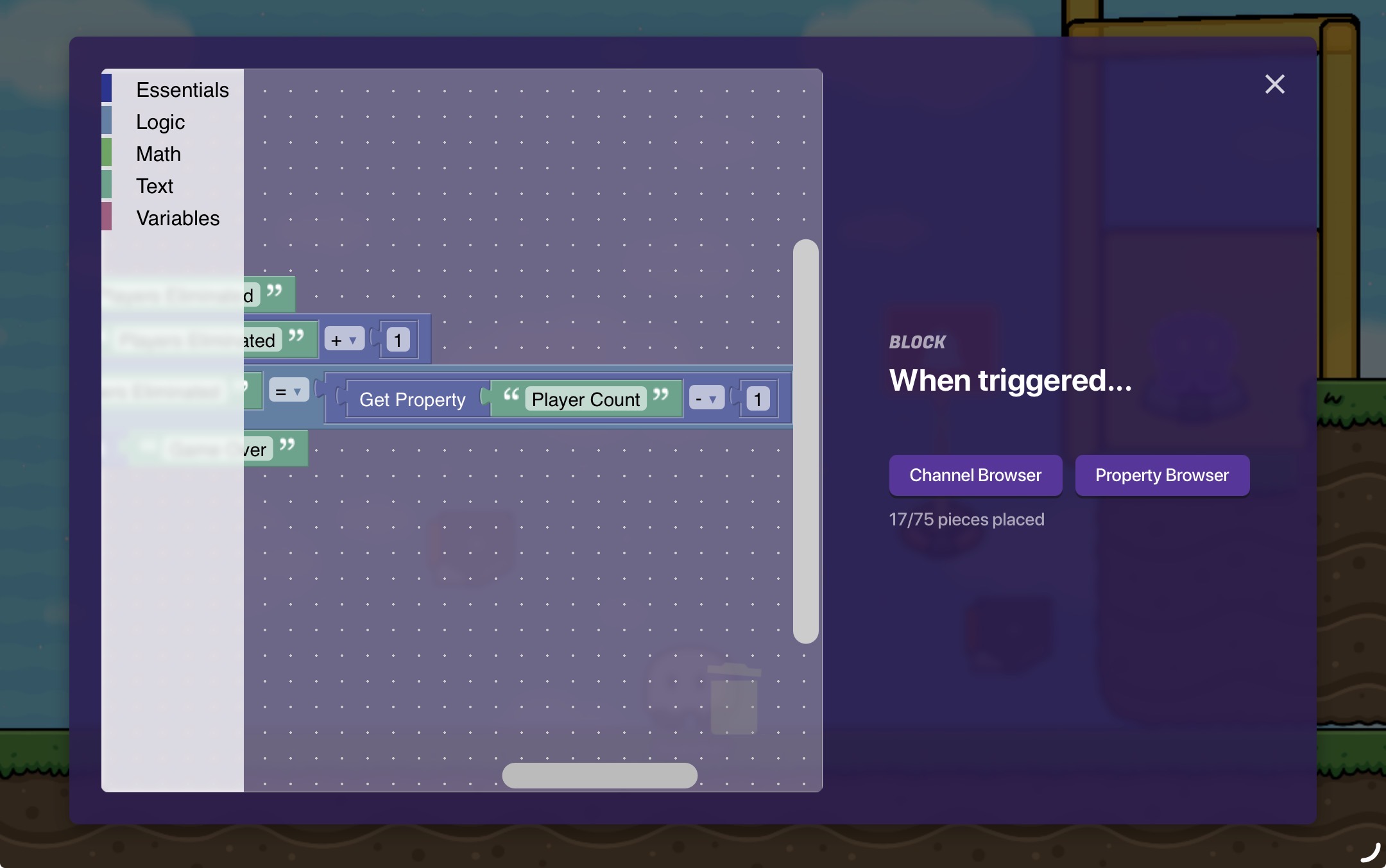 First, place two properties down, call one “players count” and one “players eliminated” they should both be global number properties.