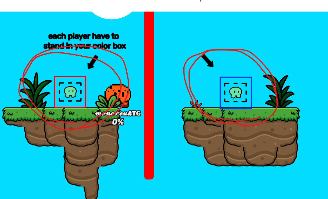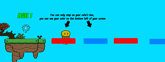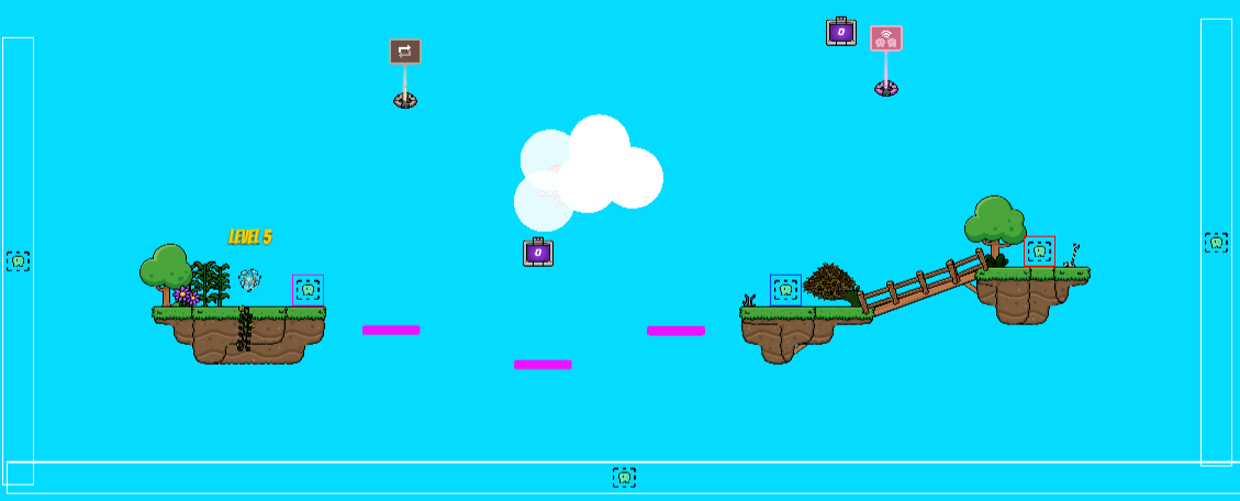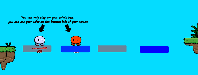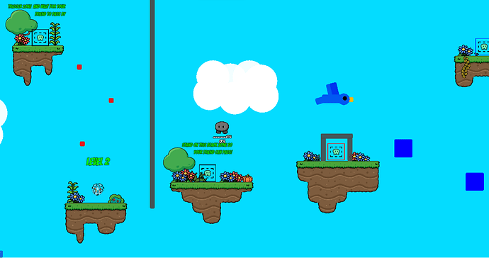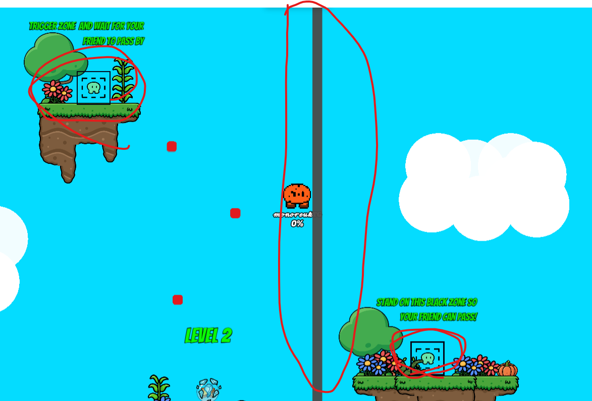 At the start of the level, one person gets a speed boost and uses that to open up the rest of the level for their partner. Filled with near-impossible jumps (such as coyote, single-block, etc.) and a confusingly-colored background to make the players doubt where theyâre going (Such as a non-collision barrier colored blue behind a red jump).