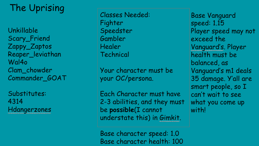 And we’re back! For everyone who helped with the first topic, thanks a ton, but now it’s time for… the characters! I randomly selected 6 users besides me who helped on the first post to be in the game, and here they are! (If you even posted once on that thing you were in the running)