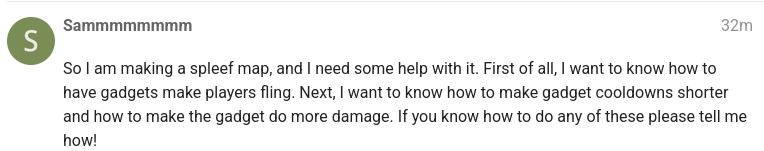 So I am making a spleef map, and I need some help with it. First of all, I want to know how to have gadgets make players fling. Next, I want to know how to make gadget cooldowns shorter and how to make the gadget do more damage. If you know how to do any of these please tell me how!