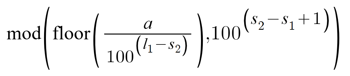 Then, by taking the modulo of that and 100^s2-s1+1, we can clip off the front of the number. Now, we have the slice we want!