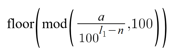 Where a is the number you are working with, l1 is the length of the string, and n is the index of the letter you want to get.This equation basically just clips out the front and end of the number, to leave the original remaining. a divided by 100 to the power of l1 minus n will result in all the digits we don’t want being moved to decimal places in the number. Then, taking the mod of that number and 100 will get the last two numbers in the remaining number, which is the letter code we want.