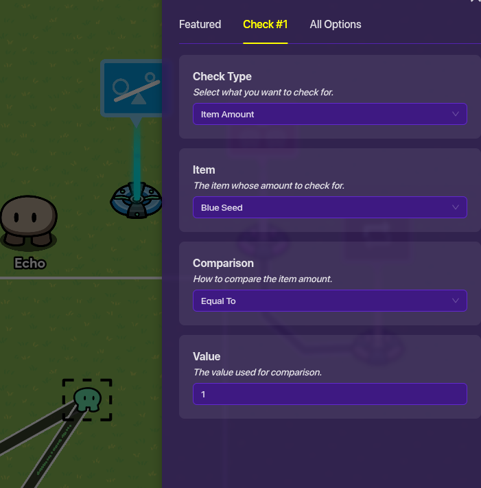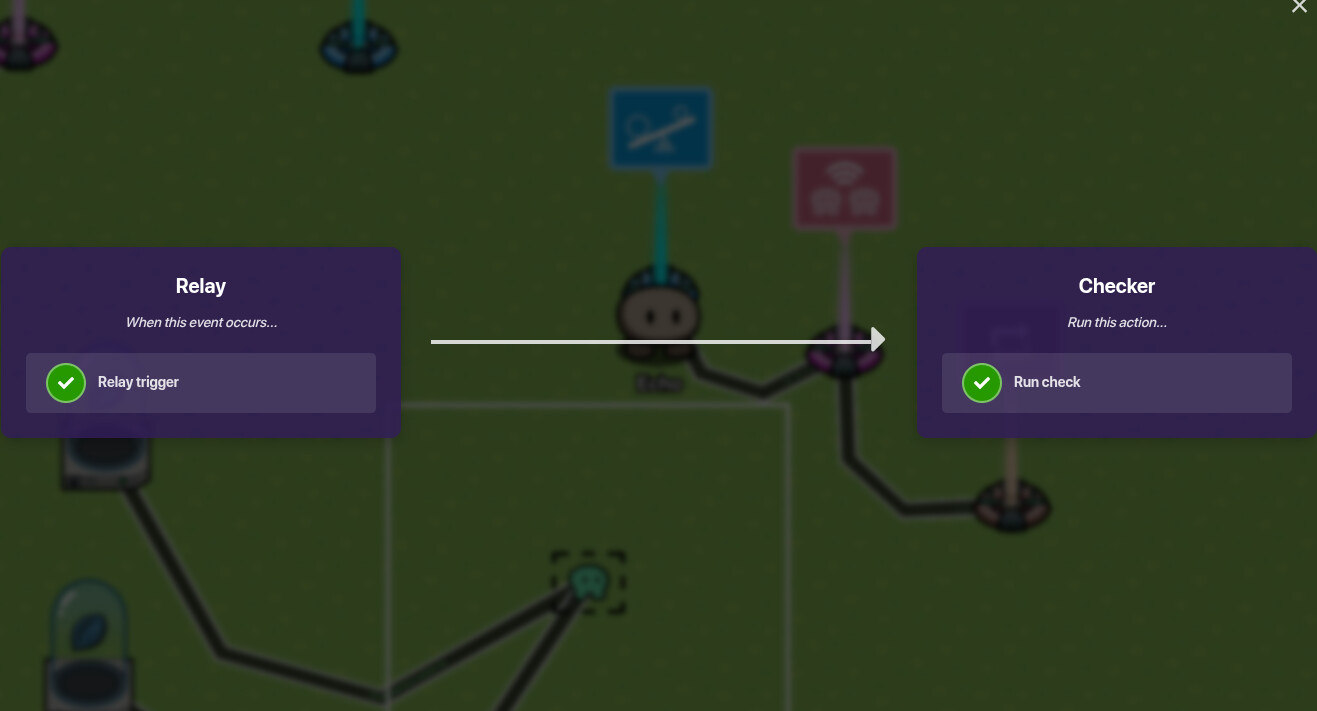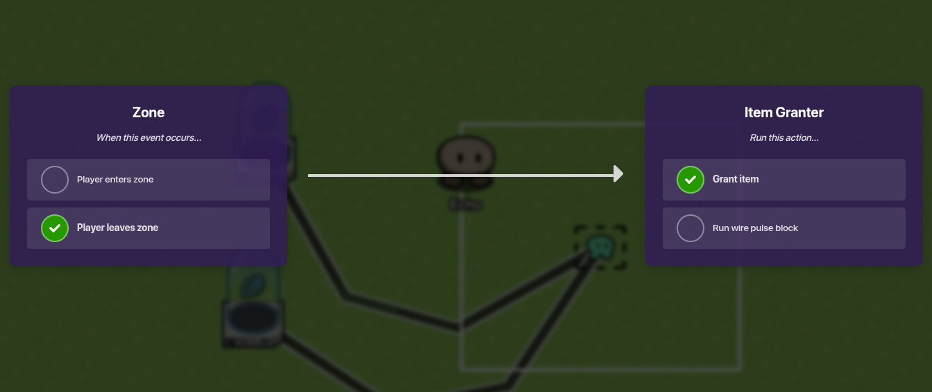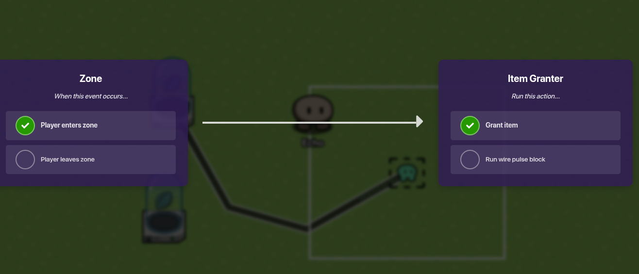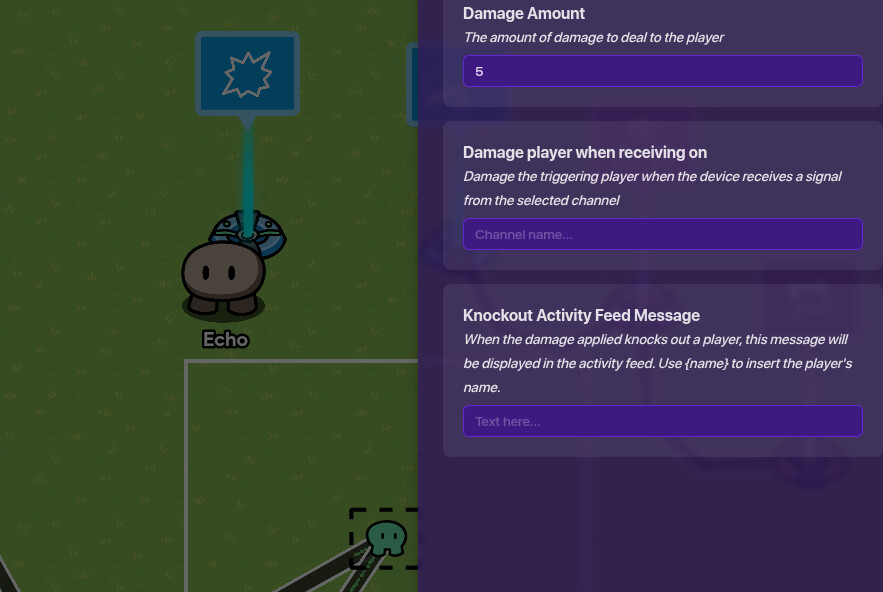 (I’m going to assume you already know how to make it dark) Set up a zone that covers the whole camp area. Connect an item granter to the zone using wires. Put “When player enters zone” “grant item.” The item granters should grant a single blue seed. Then, set up another item granters, and set it to granting -1 blue seed. Connect the zone to it, and check “When player leaves zone” “Grant item.” Now, you have a system to tell when the player is at camp. Next, set up a repeater. Set is to deactivate by receiving on a channel. Then, set it up so that it activates during the night, and is disabled during the day. (Connect it to the channel you use to activate/deactivate barrier that makes it dark). Make the repeater repeat every 3 seconds. Now, get an checker. In the settings, go to the check 1 tab, and set the item to blue seed. Now, pull up a relay. Connect the relay to the repeater. Check “When repeater runs task” “Trigger relay”. Now, connect the relay to the checker. “When relay trigger” “Run check.” Finally, get a damager. Set the damage amount to five. Connect the checker to the damager. Check “If check fails” “Damage player.” Now, you have a night system that damages any players who aren’t in the camp.