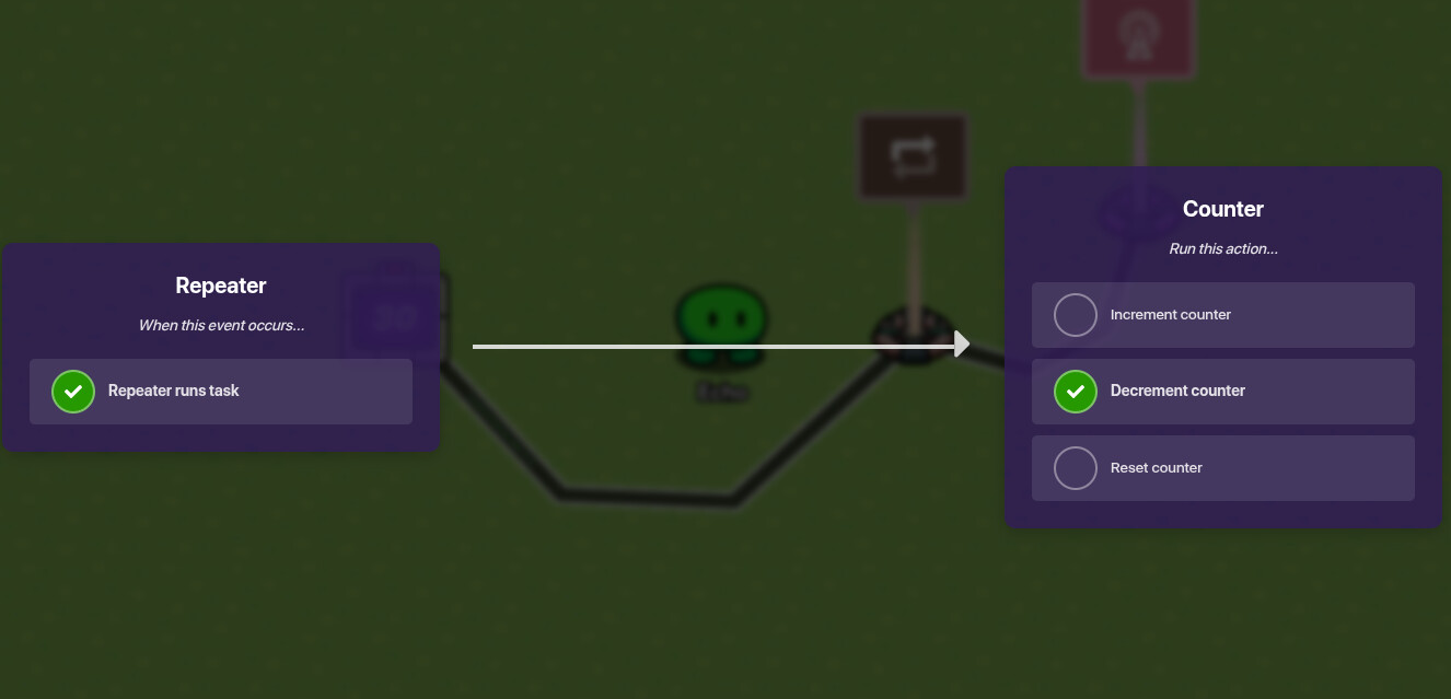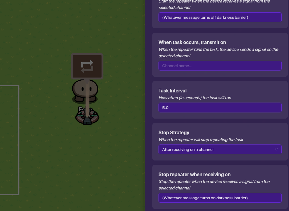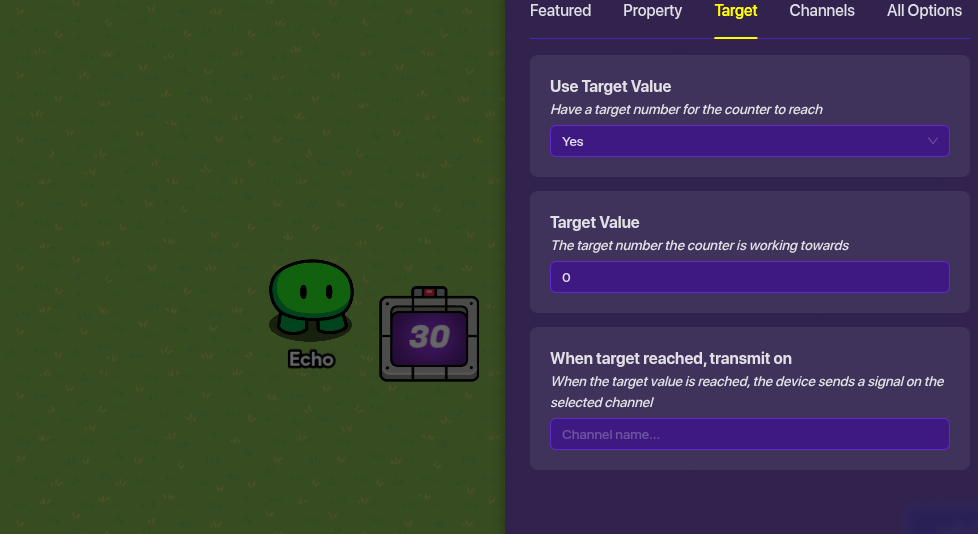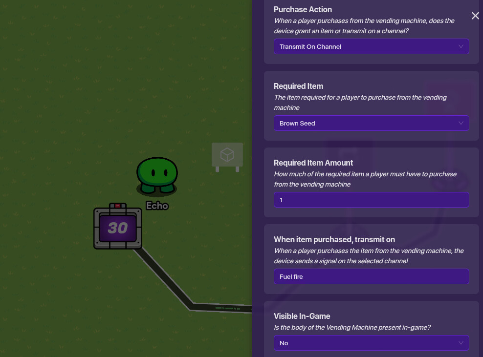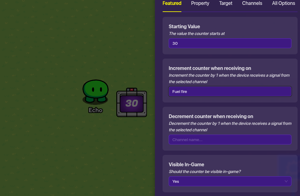 Start by getting a counter. Set the starting value to 30. Now, get a repeater. Set it to stop after receiving on a channel, but don’t put a channel down so it never stops. Make it run every five seconds. Wire a lifecycle to the repeater. Check “when event occurs” “start repeater”. Connect the repeater to the counter. Check “When repeater runs task” “Decrement counter”. Now, set the counter goal to 0. Set up a vending machine. Set it to transmit on channel, set the required item to brown seed (Wood) and set visible in game to no. Set When item purchased, transmit on to “Fuel fire”. Set the item name to fire, the description to Fuel the fire, and the interaction time to instant. Now, go back to the counter settings, and set increment counter to ‘Fuel fire’. The fire will now go up when you put in wood. Finally, get a game end device. Wire it to the counter, and check “when target value reached” “end game” Now, put the vending machine under whatever prop represents your fire.