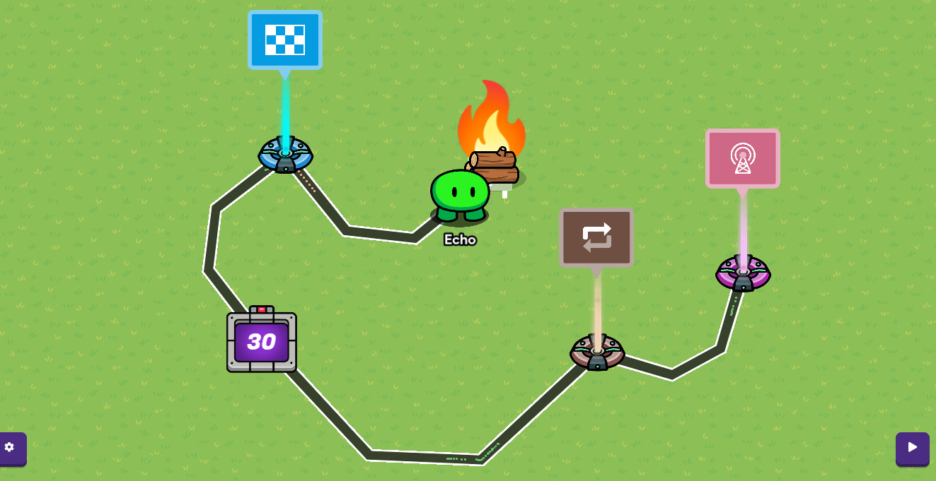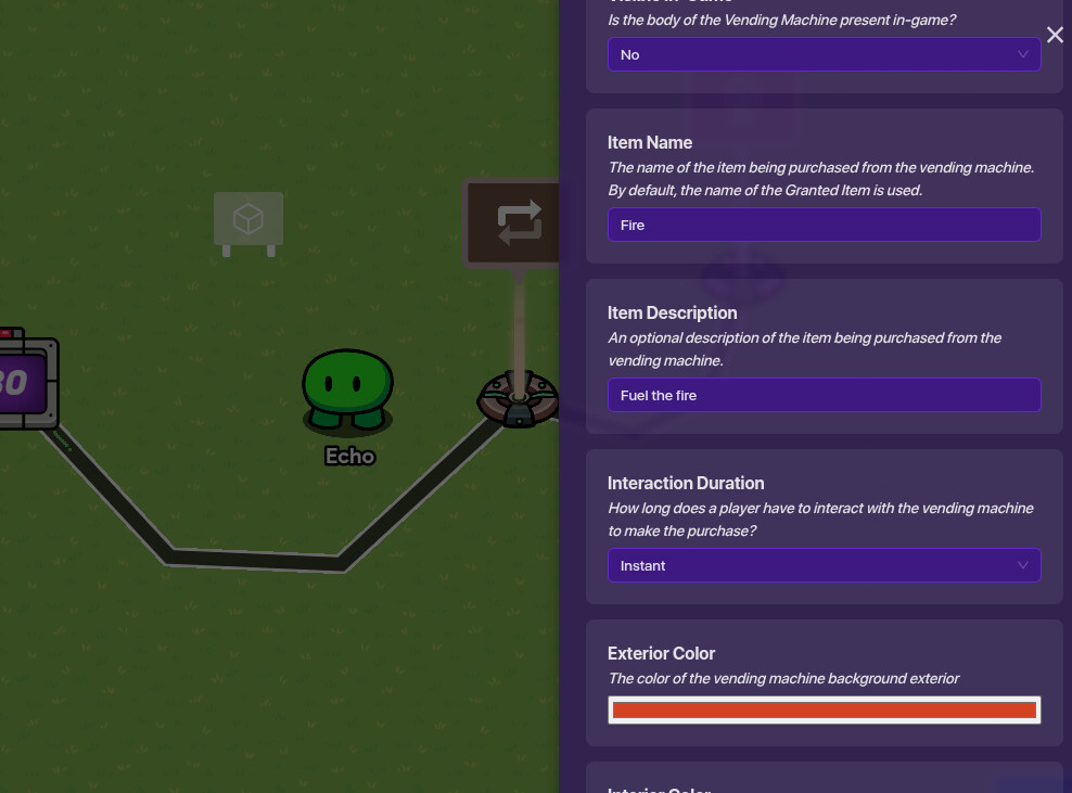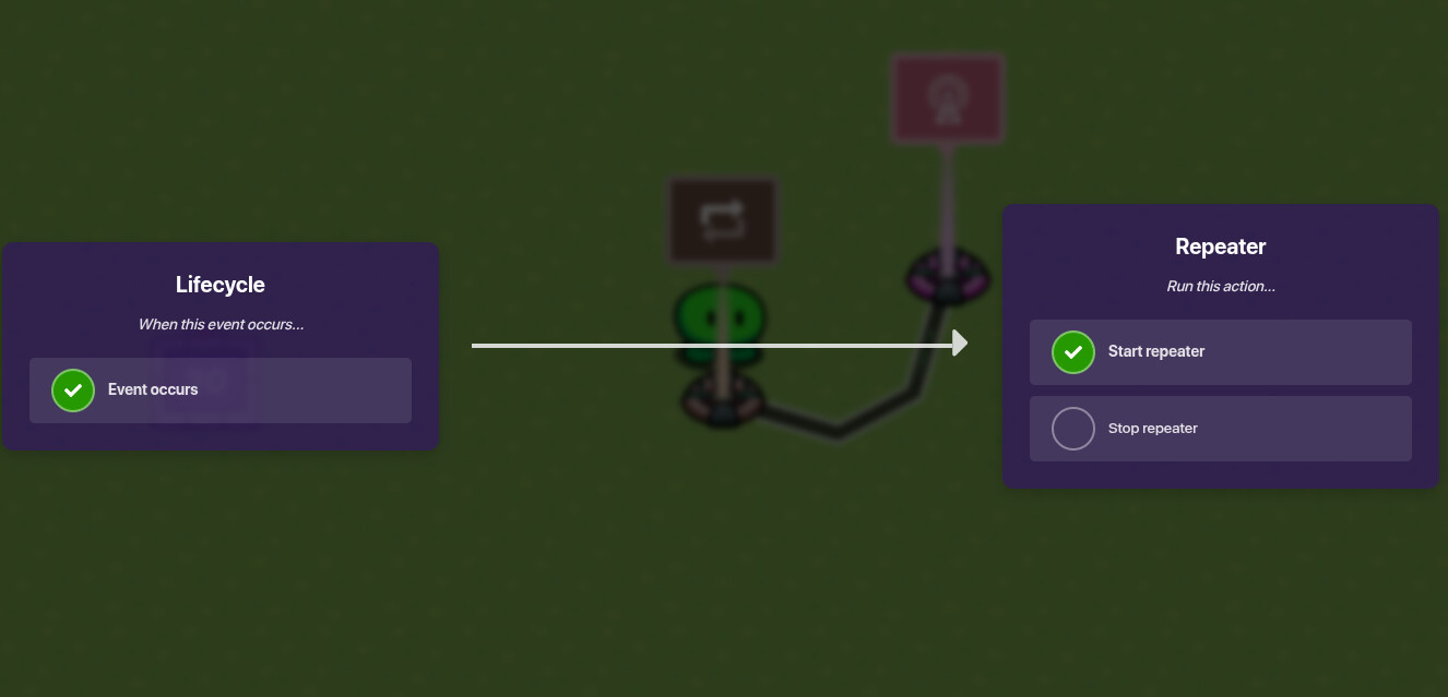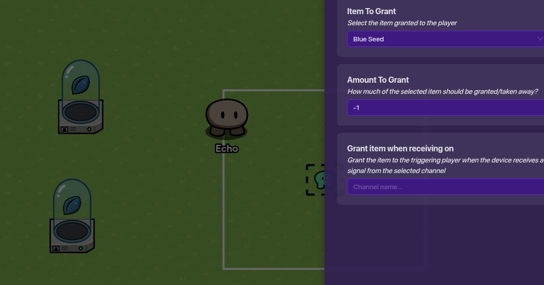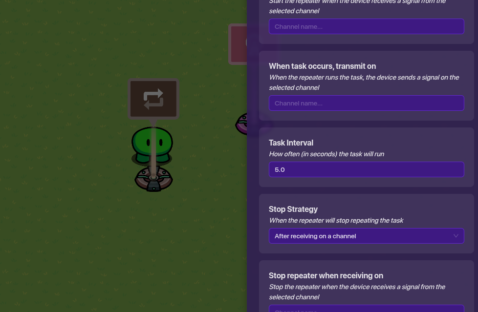 Start by getting a counter. Set the starting value to 30. Now, get a repeater. Set it to stop after receiving on a channel, but don’t put a channel down so it never stops. Make it run every five seconds. Wire a lifecycle to the repeater. Check “when event occurs” “start repeater”. Connect the repeater to the counter. Check “When repeater runs task” “Decrement counter”. Now, set the counter goal to 0. Set up a vending machine. Set it to transmit on channel, set the required item to brown seed (Wood) and set visible in game to no. Set When item purchased, transmit on to “Fuel fire”. Set the item name to fire, the description to Fuel the fire, and the interaction time to instant. Now, go back to the counter settings, and set increment counter to ‘Fuel fire’. The fire will now go up when you put in wood. Finally, get a game end device. Wire it to the counter, and check “when target value reached” “end game” Now, put the vending machine under whatever prop represents your fire.