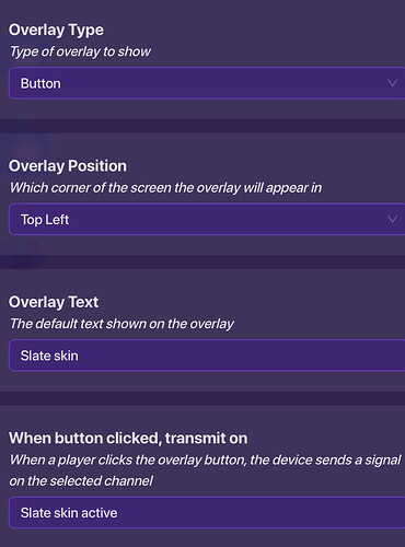 place a game overlay and have it be a button, which should activate slate skin, and have it deactivate when used, with another channel