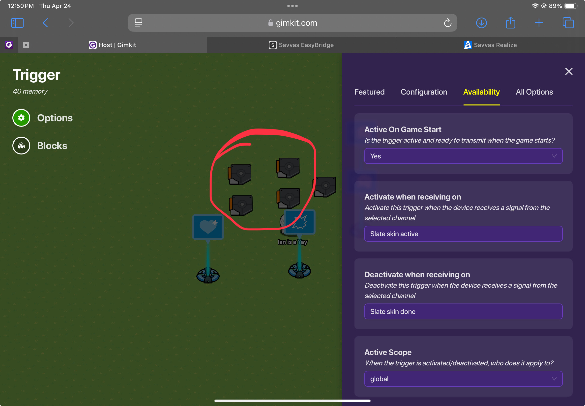 Step 4: Place a relay that relays channel âStun K!llerâ (if you did the shedletsky guide you should already have this set up, if not its just a speed modifier that sets the speed to 0 when receiving on âStun K!llerâ) to all players on team 1, when receiving on âGashing Wound Survivorâ
