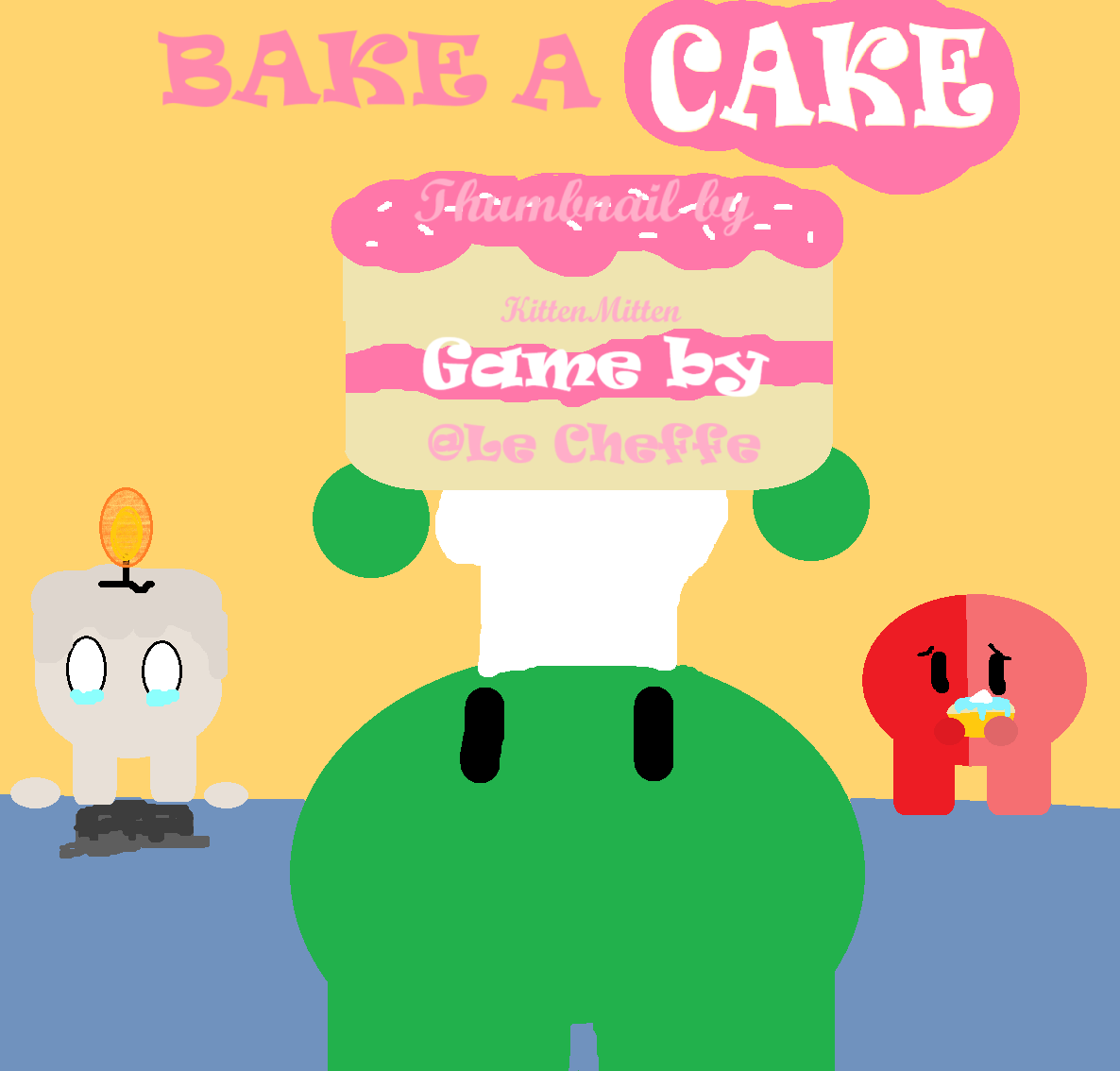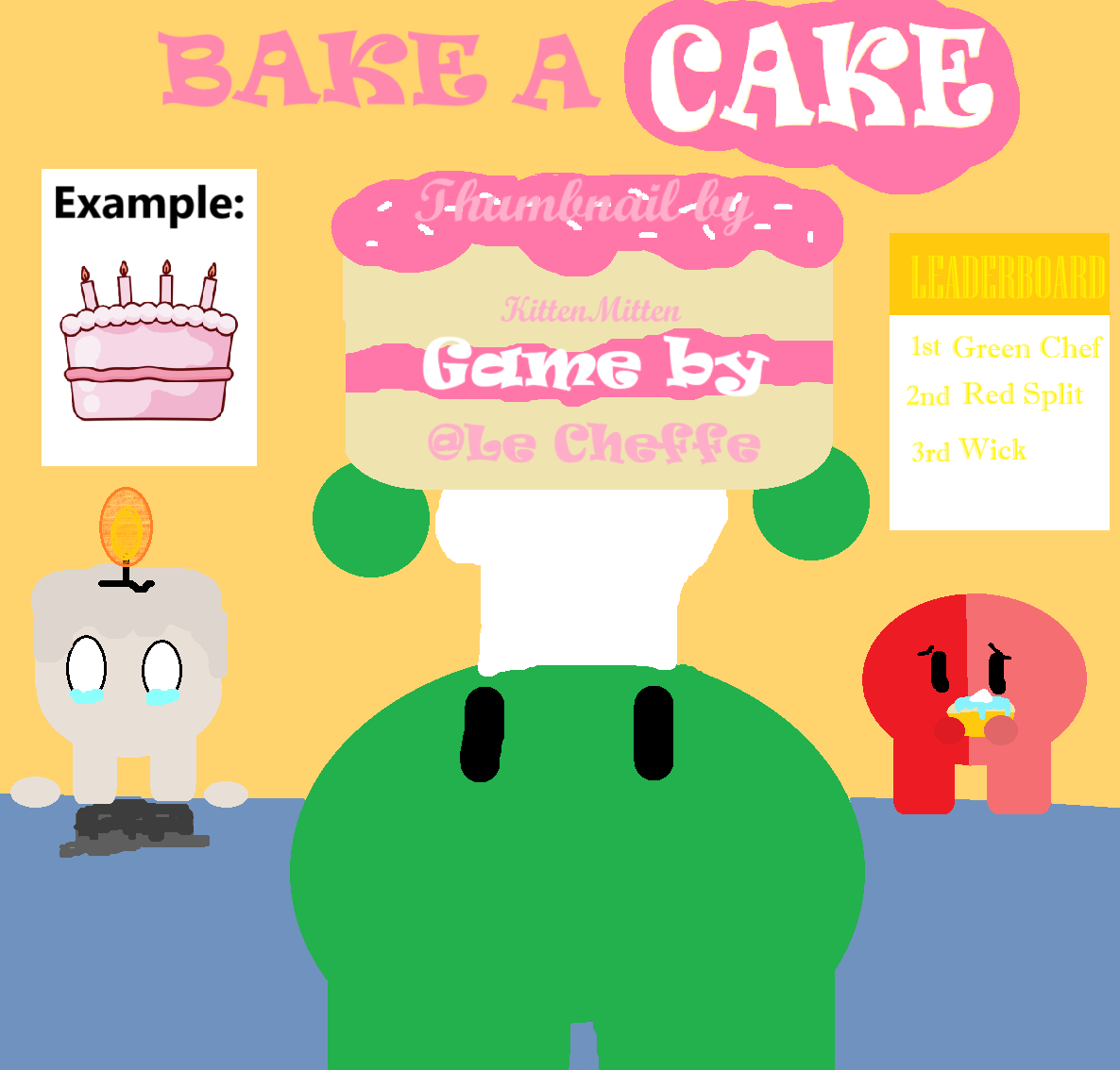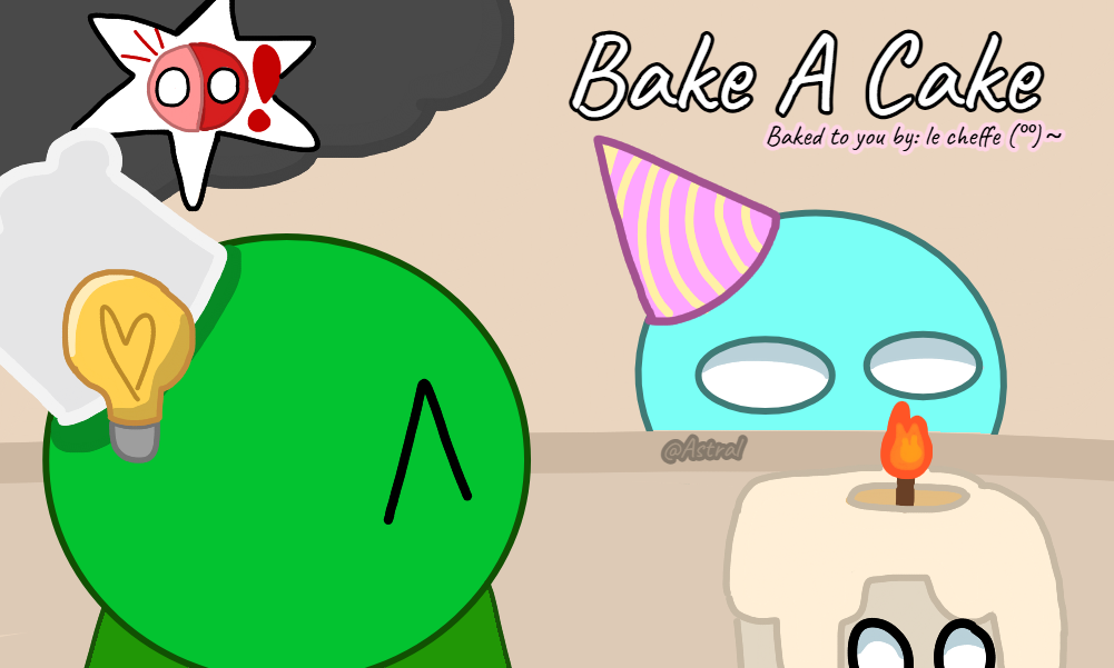 (Artist’s note: Wick had made his cake perfectly but accidently burnt it with his candle. Red Split is disappointed in himself because what he made is very small compared to the green chef’s cake.)