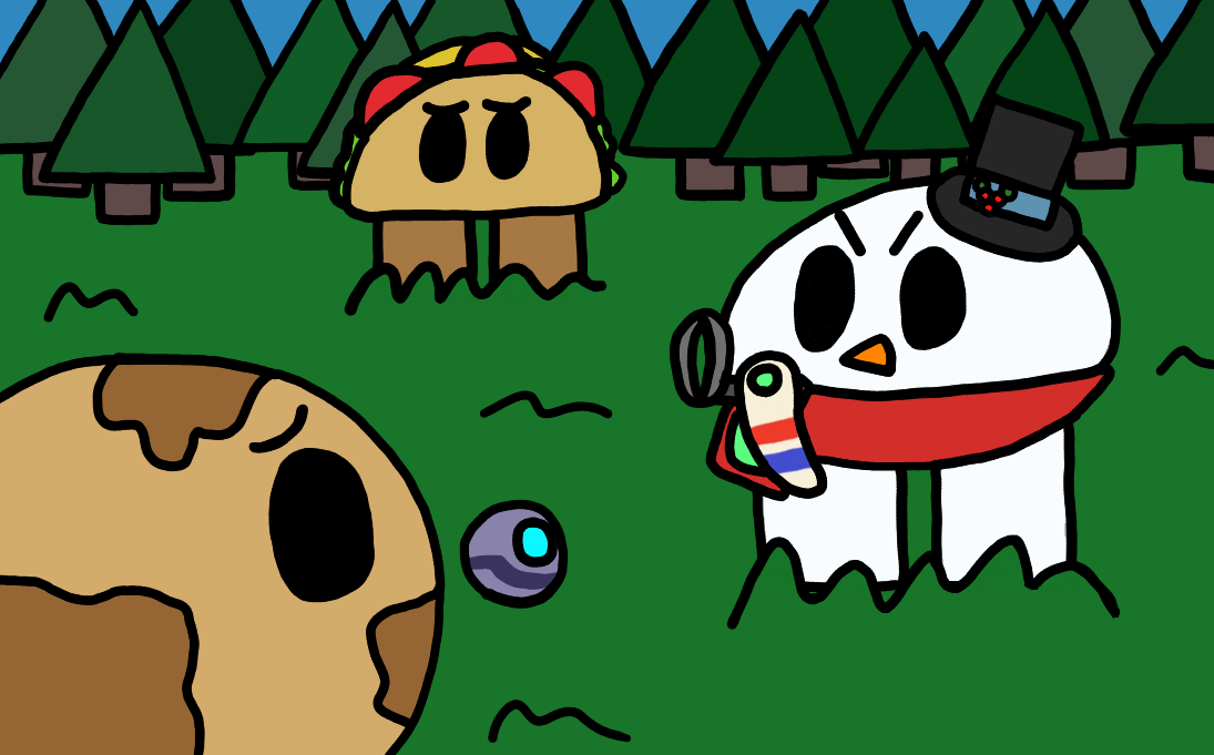 Gim actions: Fiesta is just standing there, frostington has a blaster pointed at camo, and camo has a zapper pointed at frostington.