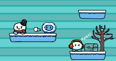 Actions: icebeard is pointing a snowball launcher at frostington, while frostington is running away, snowmuff is standing on a gray space container.