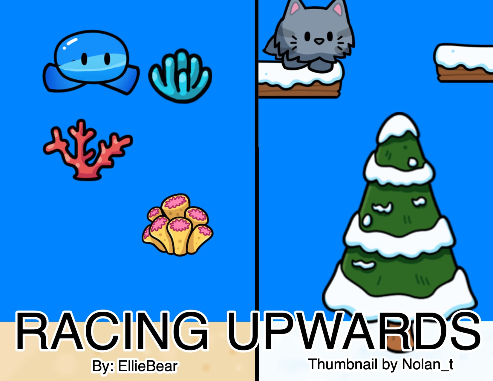Summary of Game: two players start in different places, one is summer themed and the other is winter themed the players have to race to the top of the platformer and whoever reaches the top first wins the game.