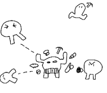 - A Gim looks scared/tired, and is using a medkit to heal, while another Gim is sneaking upon that gim