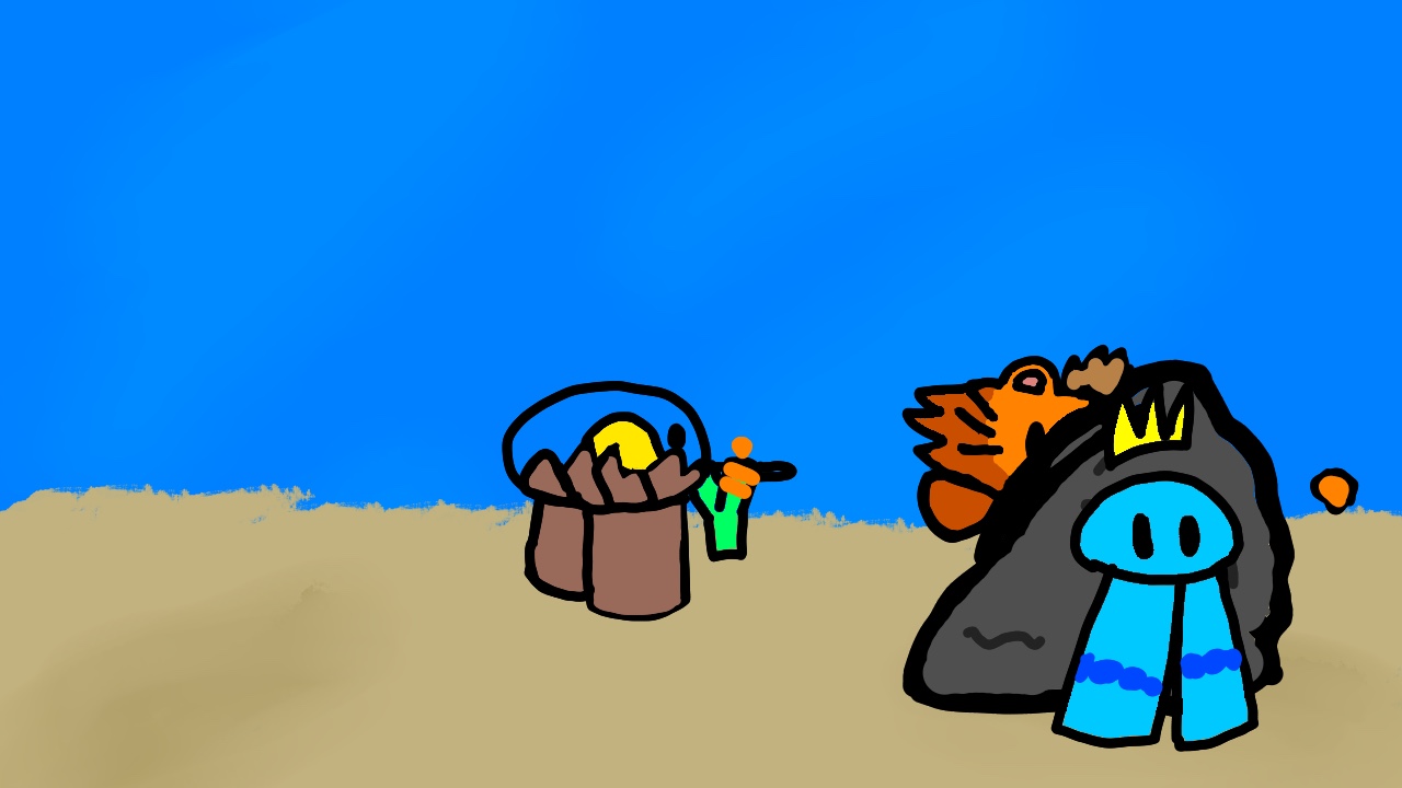 Actions: my oc ABSOLUTELY DESTROYING SCAREDY CAT WITH A QUANTUM PORTAL, scaredy cat flying away to infinity and beyond with 999% fragility, random huddling behind a rock, and horizino fighting rags, with rags having [Reloading..] above him.